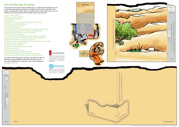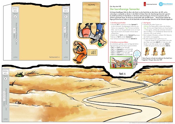 Kinder können die Geschichte des barmherzigen Samariters (4. Einheit der KiBiWo "Mensch Jesus! Willkommen in der Kinderstadt") nachspielen, in dem sie ein Figurentheater basteln und damit die Szenen nachstellen. Dabei kann mit den Kindern über die Frage „Wer ist mein Nächster“ aus den unterschiedlichen Perspektiven gesprochen werden. Die Geschichte ist auf dem Bastelbogen abgedruckt.