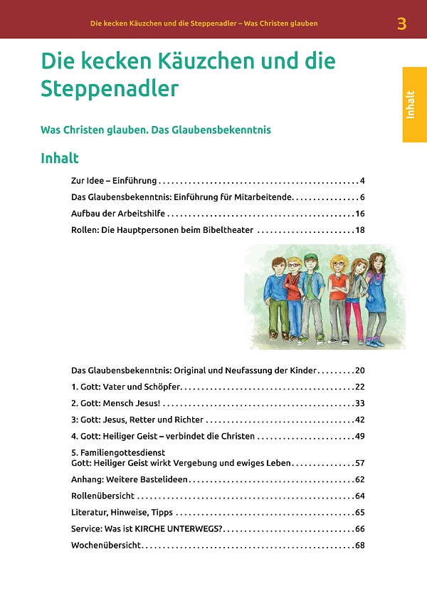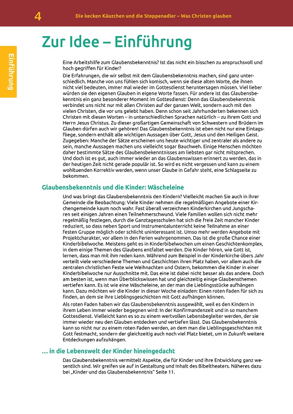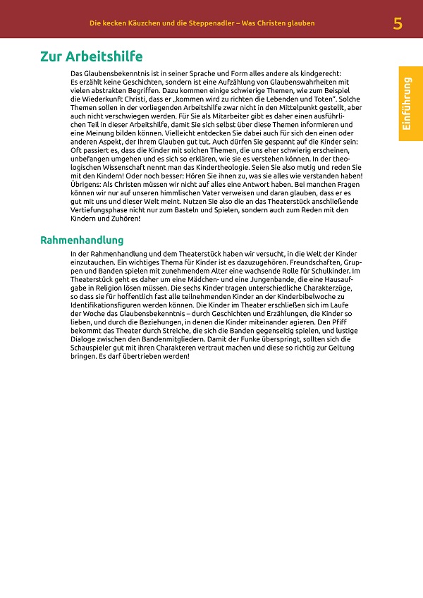 Die Arbeitshilfe enthält neben den fünf Programmentwürfen mit Bibeltheater, Gesprächsimpulsen und spielerisch-kreative Kleingruppen-Angebote, für Mitarbeitende eine ausführliche theologisch-didaktische Einführung ins Glaubensbekenntnis. Die farbige Broschüre umfasst 68 A4-Seiten.