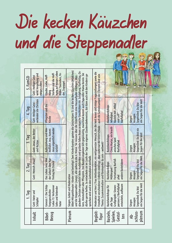 Hausaufgaben während der Ferien sorgen nicht für Heiterkeit. Chillen und abhängen wäre viel cooler. Stattdessen müssen die Kinder überlegen, was Christen glauben. Aber die beiden Kinderbanden „Die kecken Käuzchen“ und die „Die Steppenadler“ machen das Beste draus. Und so entsteht nicht nur eine spannende Geschichte mit viel Action auf der KiBiWo-Bühne sondern auch ein Kinder-Glaubensbekenntnis. Die beiden Banden ärgern sich gegenseitig, aber sie stacheln sich auch an. Und so spielen Karfreitag, Ostern und Himmelfahrt plötzlich im Kinderzimmer der „kecken Käuzchen“. Dabei entdecken sie, dass es beim Glauben der Christen auch um Freundschaften und Gruppen geht, um dazu gehören oder ausgegrenzt werden, um Gott und Mensch, um Schuld und Vergebung. Und um den Opa, der plötzlich stirbt. Die Lebenserfahrungen der Kinder und selbst inszenierte biblische Geschichten erschließen so das alte Glaubensbekenntnis und füllen es mit neuem Leben.