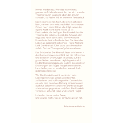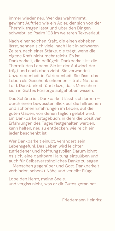 Nach einer solchen Kraft, die einen abheben lässt, sehnen sich viele: nach Halt in schweren Zeiten, nach einer Stärke, die trägt, wenn die eigene Kraft nicht mehr reicht. Es ist Dankbarkeit, die beflügelt. Dankbarkeit ist die Thermik des Lebens. Sie ist der Aufwind, der trägt und nach oben zieht. Sie verwandelt Unzufriedenheit in Zufriedenheit. Sie lässt das Leben als Geschenk erkennen – trotz Not und Leid. Dankbarkeit führt dazu, dass Menschen sich in Gottes Fürsorge aufgehoben wissen.