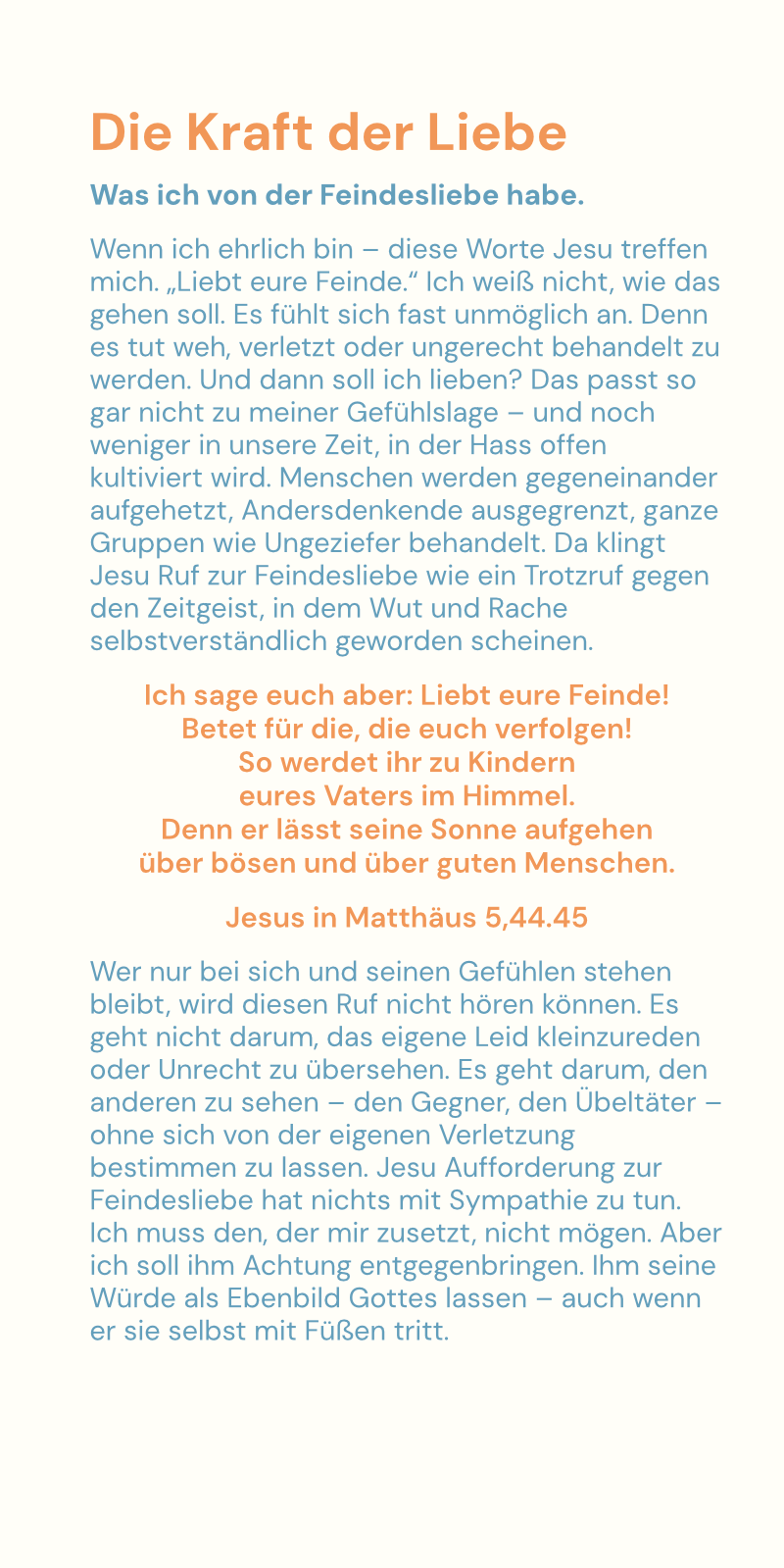 Wenn ich ehrlich bin – diese Worte Jesu treffen mich. „Liebt eure Feinde.“ Ich weiß nicht, wie das gehen soll. Es fühlt sich fast unmöglich an. Denn es tut weh, verletzt oder ungerecht behandelt zu werden. Und dann soll ich lieben? Das passt so gar nicht zu meiner Gefühlslage – und noch weniger in unsere Zeit, in der Hass offen kultiviert wird. Menschen werden gegeneinander aufgehetzt, Andersdenkende ausgegrenzt, ganze Gruppen wie Ungeziefer behandelt. Da klingt Jesu Ruf zur Feindesliebe wie ein Trotzruf gegen den Zeitgeist, in dem Wut und Rache selbstverständlich geworden scheinen.