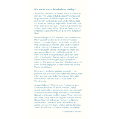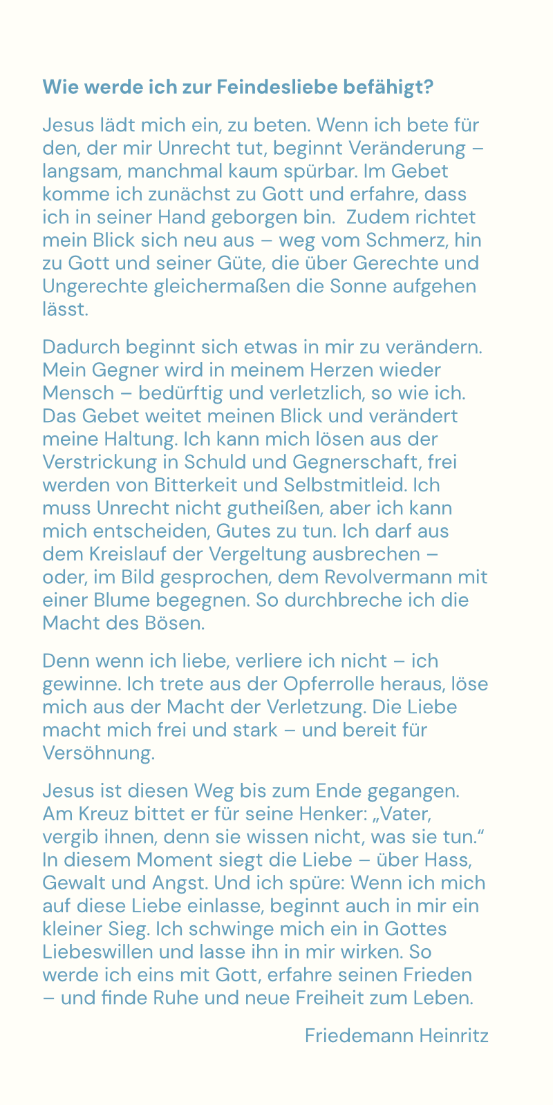 Dadurch beginnt sich etwas in mir zu verändern. Mein Gegner wird in meinem Herzen wieder Mensch – bedürftig und verletzlich, so wie ich. Das Gebet weitet meinen Blick und verändert meine Haltung. Ich kann mich lösen aus der Verstrickung in Schuld und Gegnerschaft, frei werden von Bitterkeit und Selbstmitleid. Ich muss Unrecht nicht gutheißen, aber ich kann mich entscheiden, Gutes zu tun. Ich darf aus dem Kreislauf der Vergeltung ausbrechen – oder, im Bild gesprochen, dem Revolvermann mit einer Blume begegnen. So durchbreche ich die Macht des Bösen.