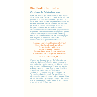 DIN lang, hoch. Mit biblischen Impuls zu Matthäus 5,44: "Liebet eure Feinde, betet für die, die euch verfolgen."