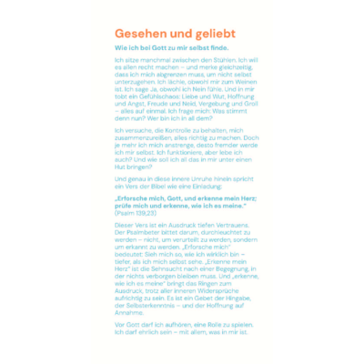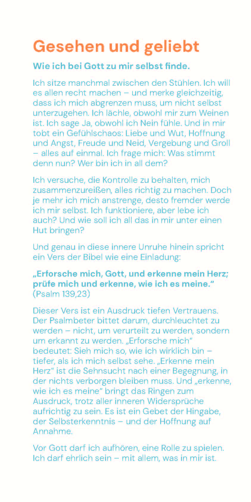 Vor Gott darf ich aufhören, eine Rolle zu spielen. Ich darf ehrlich sein – mit allem, was in mir ist. Gott hält meine Widersprüche aus. Er läuft nicht weg, wenn ich mich selbst nicht mehr verstehe. Er schaut mich an – ganz. Und liebt mich – ganz.