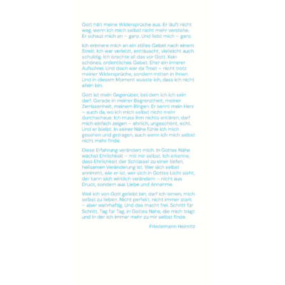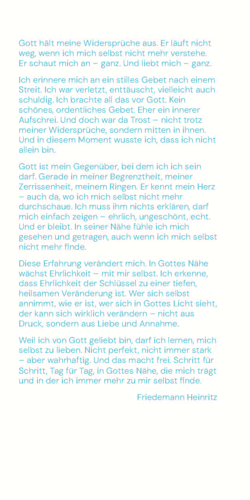 Weil ich von Gott geliebt bin, darf ich lernen, mich selbst zu lieben. Nicht perfekt, nicht immer stark – aber wahrhaftig. Und das macht frei. Schritt für Schritt, Tag für Tag, in Gottes Nähe, die mich trägt und in der ich immer mehr zu mir selbst finde.