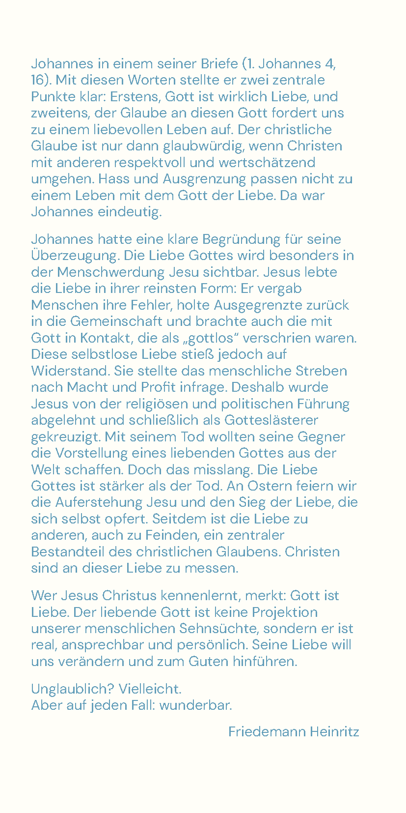„Gott ist Liebe; und wer in der Liebe bleibt, bleibt in Gott, und Gott bleibt in ihm.“, schrieb Johannes in einem seiner Briefe (1. Johannes 4,16). Mit diesen Worten stellte er zwei zentrale Punkte klar: Erstens, Gott ist wirklich Liebe, und zweitens, der Glaube an diesen Gott fordert uns zu einem liebevollen Leben auf. Der christliche Glaube ist nur dann glaubwürdig, wenn Christen mit anderen respektvoll und wertschätzend umgehen. Hass und Ausgrenzung passen nicht zu einem Leben mit dem Gott der Liebe. Da war Johannes eindeutig.