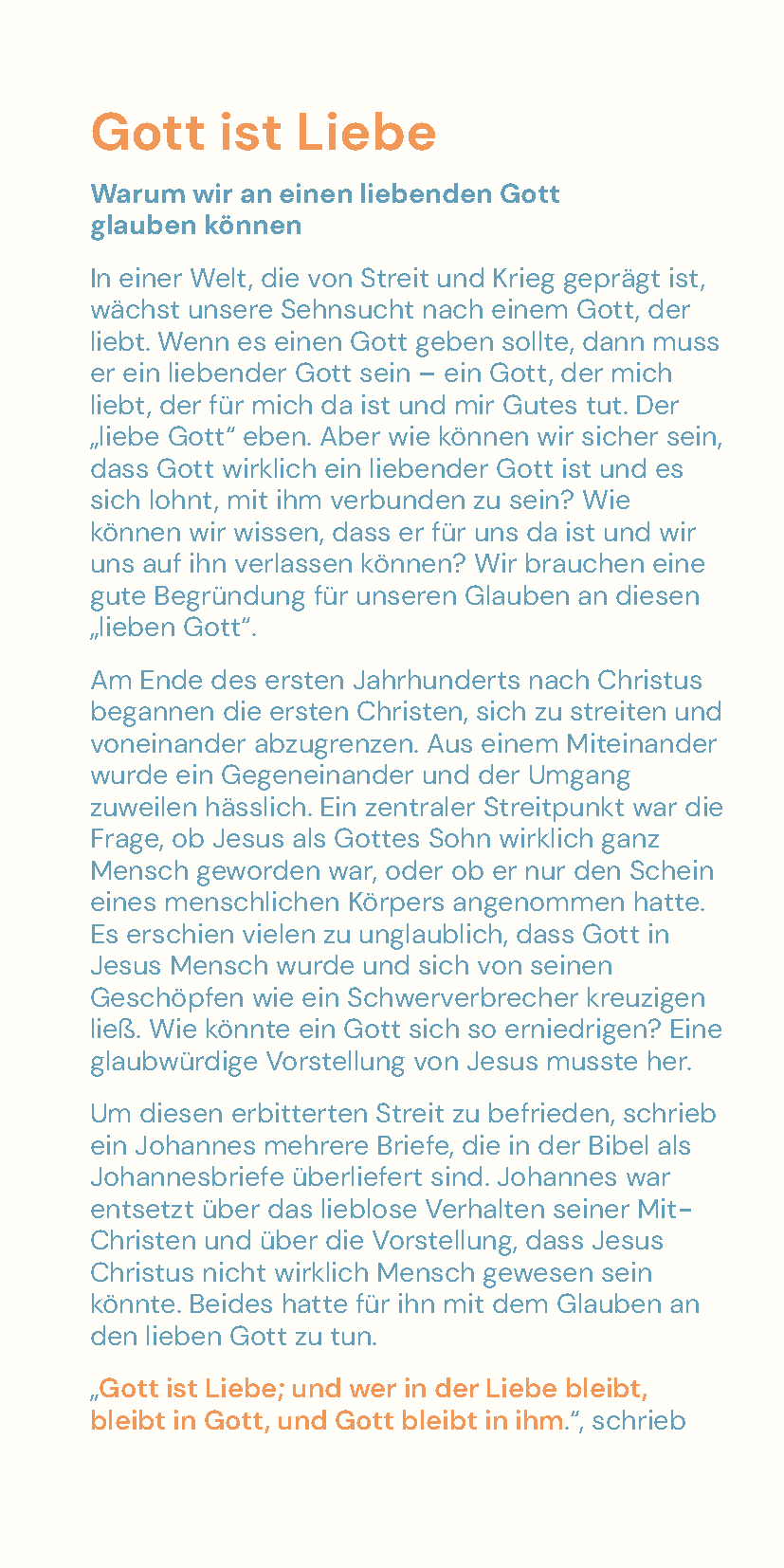 Um diesen erbitterten Streit zu befrieden, schrieb ein Johannes mehrere Briefe, die in der Bibel als Johannesbriefe überliefert sind. Johannes war entsetzt über das lieblose Verhalten seiner Mit-Christen und über die Vorstellung, dass Jesus Christus nicht wirklich Mensch gewesen sein könnte. Beides hatte für ihn mit dem Glauben an den lieben Gott zu tun.
