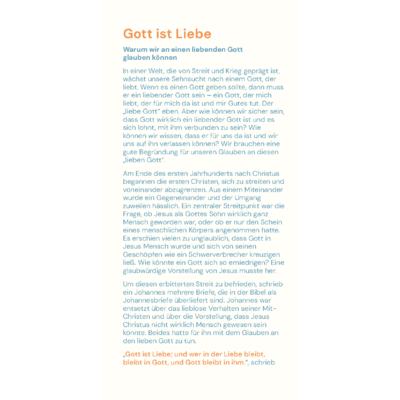 Wer Jesus Christus kennenlernt, merkt: Gott ist Liebe. Der liebende Gott ist keine Projektion unserer menschlichen Sehnsüchte, sondern er ist real, ansprechbar und persönlich. Seine Liebe will uns verändern und zum Guten hinführen.