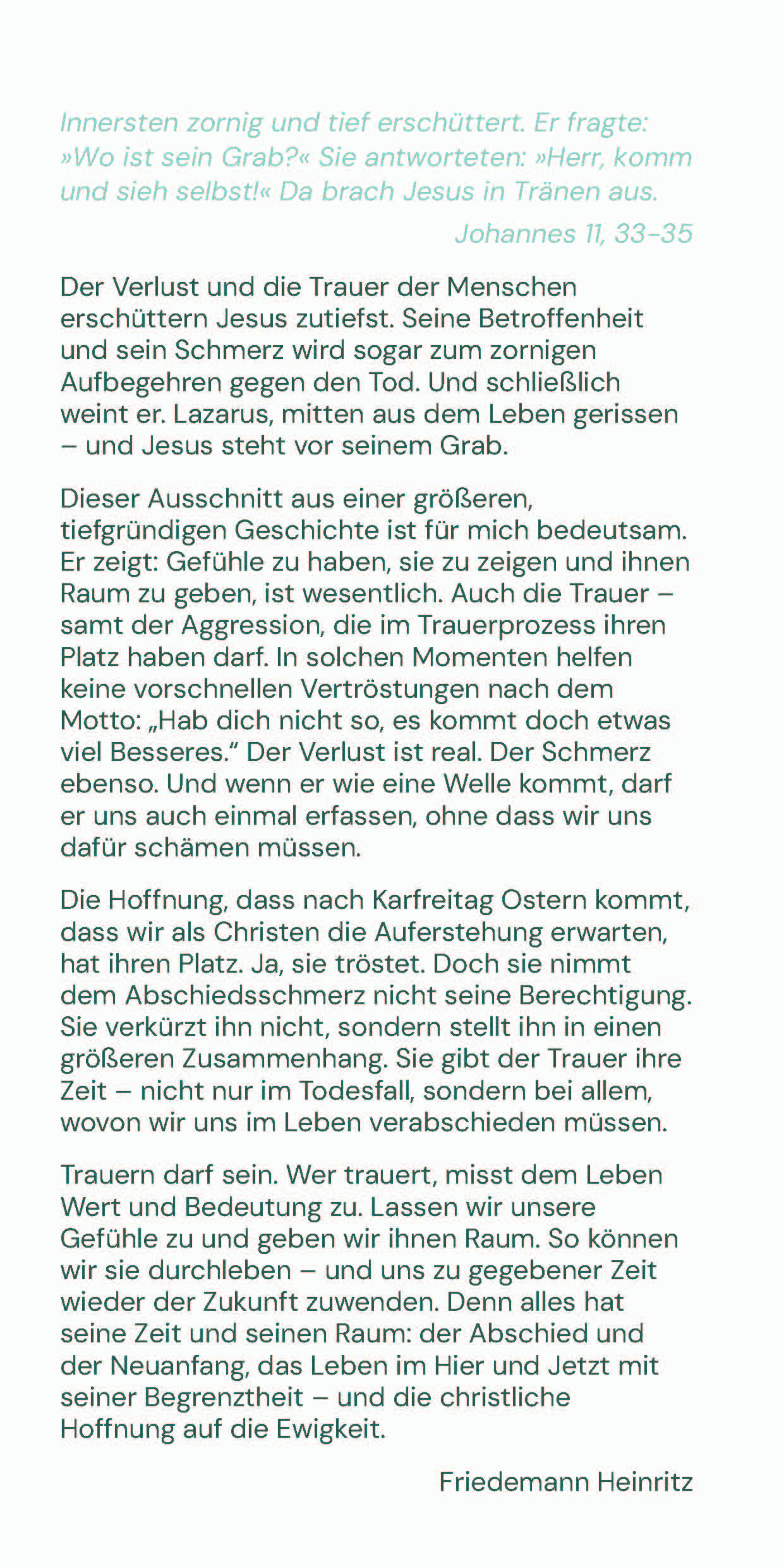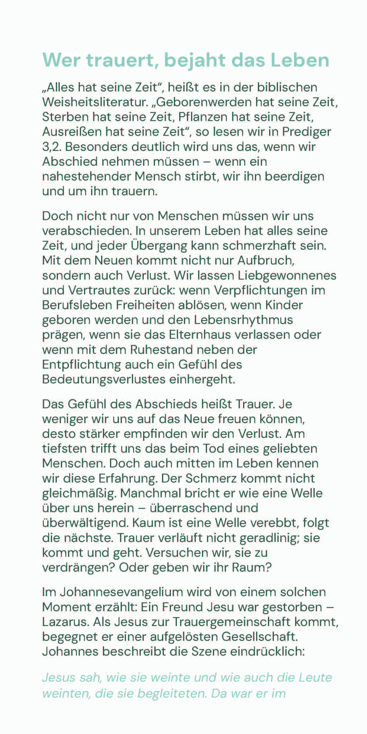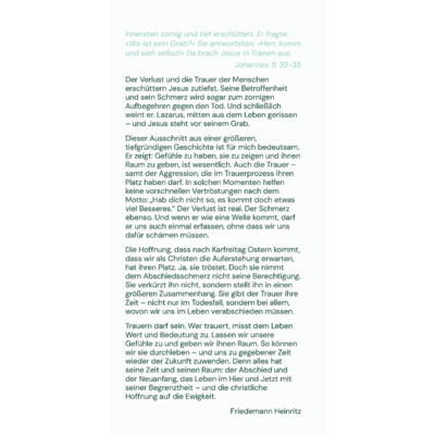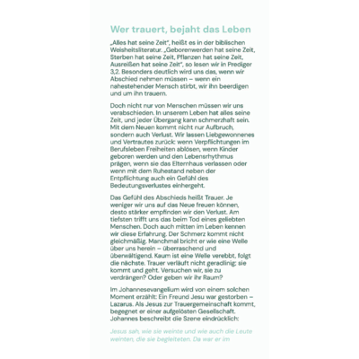 Trauern darf sein. Wer trauert, misst dem Leben Wert und Bedeutung zu. Lassen wir unsere Gefühle zu und geben wir ihnen Raum. So können wir sie durchleben – und uns zu gegebener Zeit wieder der Zukunft zuwenden. Denn alles hat seine Zeit und seinen Raum: der Abschied und der Neuanfang, das Leben im Hier und Jetzt mit seiner Begrenztheit – und die christliche Hoffnung auf die Ewigkeit.