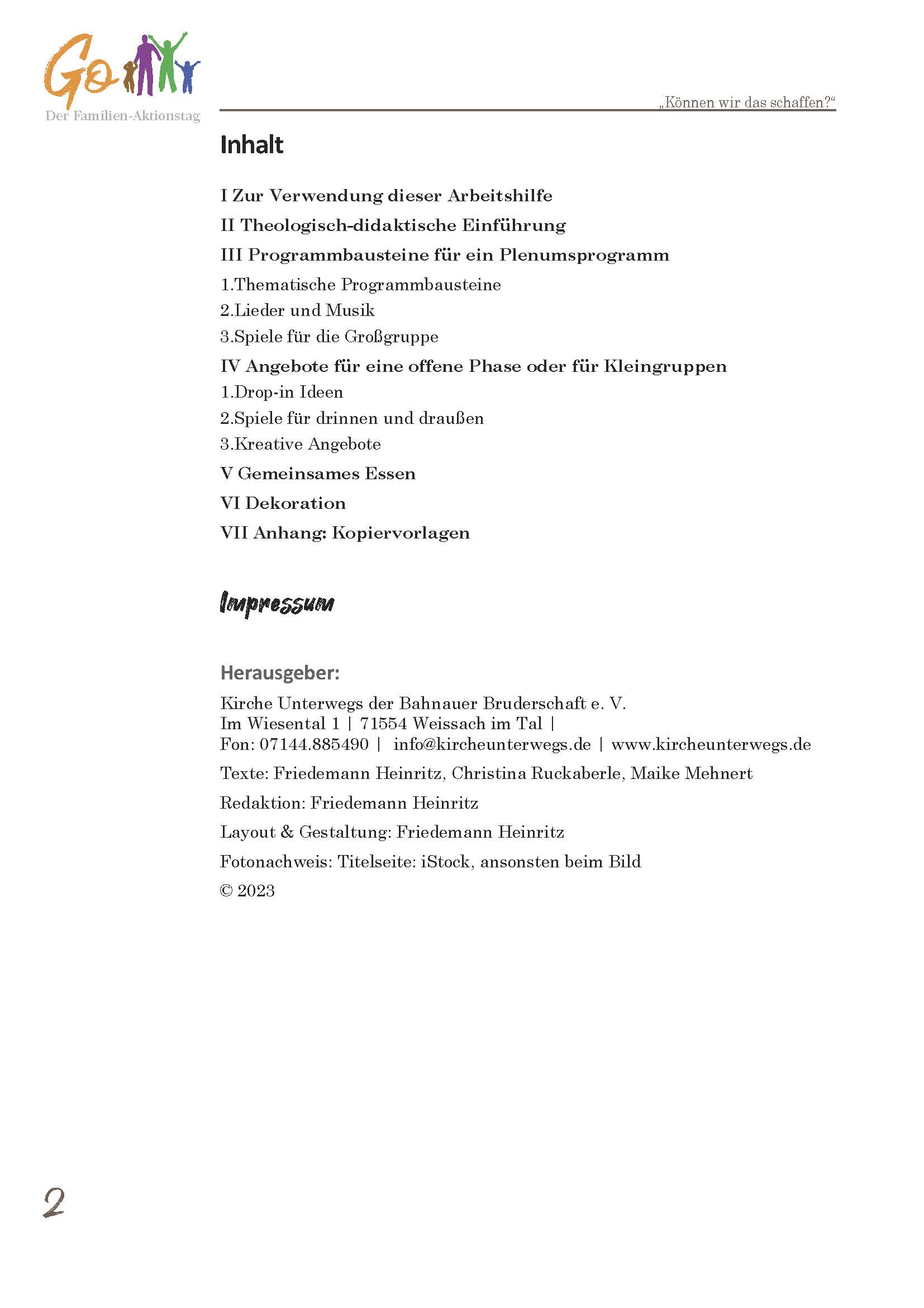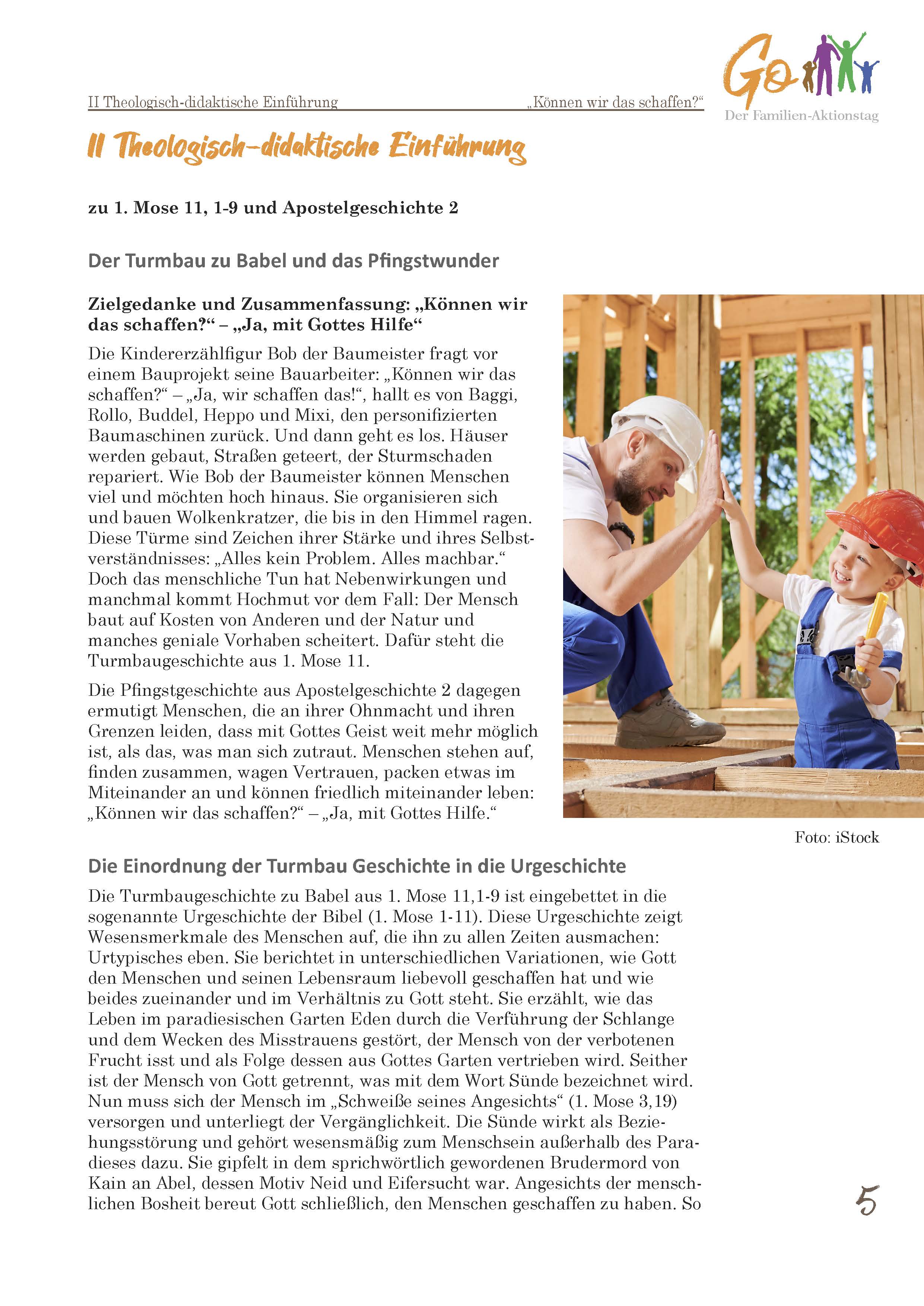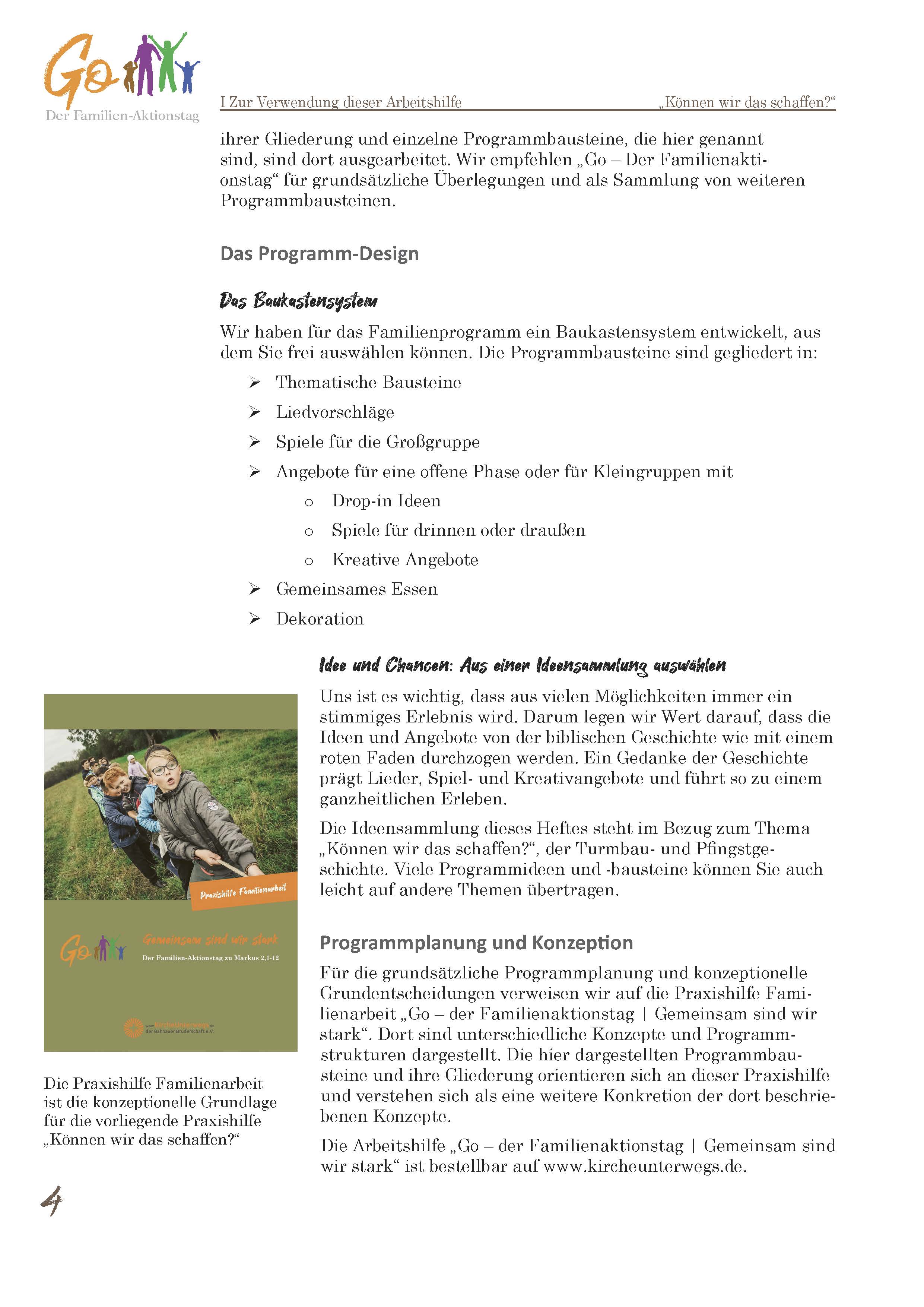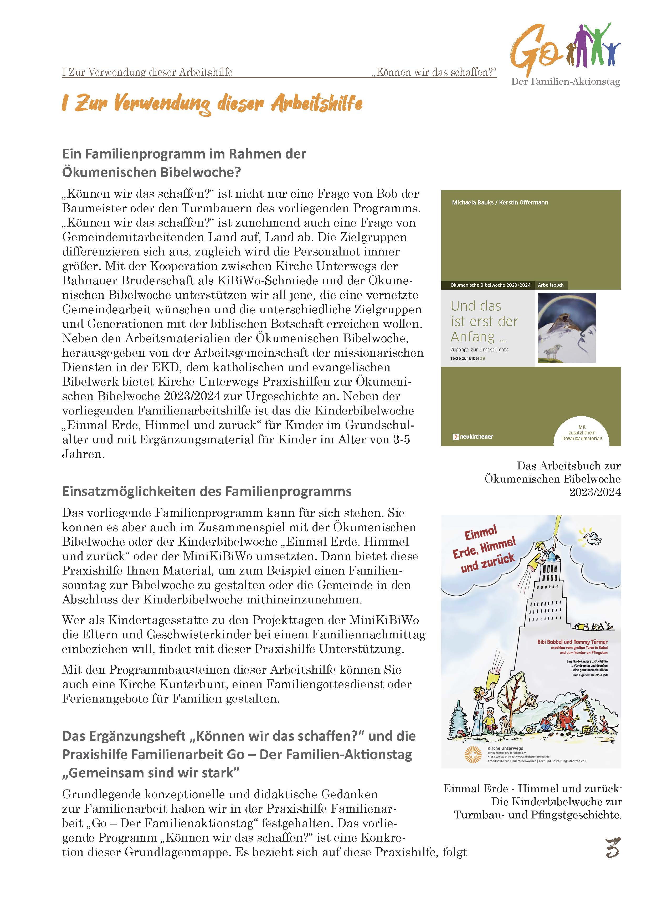 Mit der Praxishilfe "Können wir das schaffen?" liegt ein neues variables Programmkonzept zur Gestaltung eines Familien-Aktionstag, eines Kirche-Kunterbunt-Events oder eines Familien-Gottesdienstes vor. Thematisch greift das Model ein Thema der Ökumenischen Bibelwoche 2023/24 zur Urgeschichte auf. Es setzt die Turmbauschichte aus 1. Mose 11 und die Pfingstgeschichte aus Apostelgeschichte 2 in ein abwechslungsreiches Mitmach-Programm für die ganze Familie um. Die Praxishilfe enthält eine theologisch-didaktische Einführung, thematische, kreative und spielerische Programmbausteine für Plenums- und Gruppenangebote und Kopiervorlagen. Der Programmentwurf ist eine Ergänzung der konzeptionellen Praxishilfe Familienarbeit „Go, der Familien-Aktionstag“