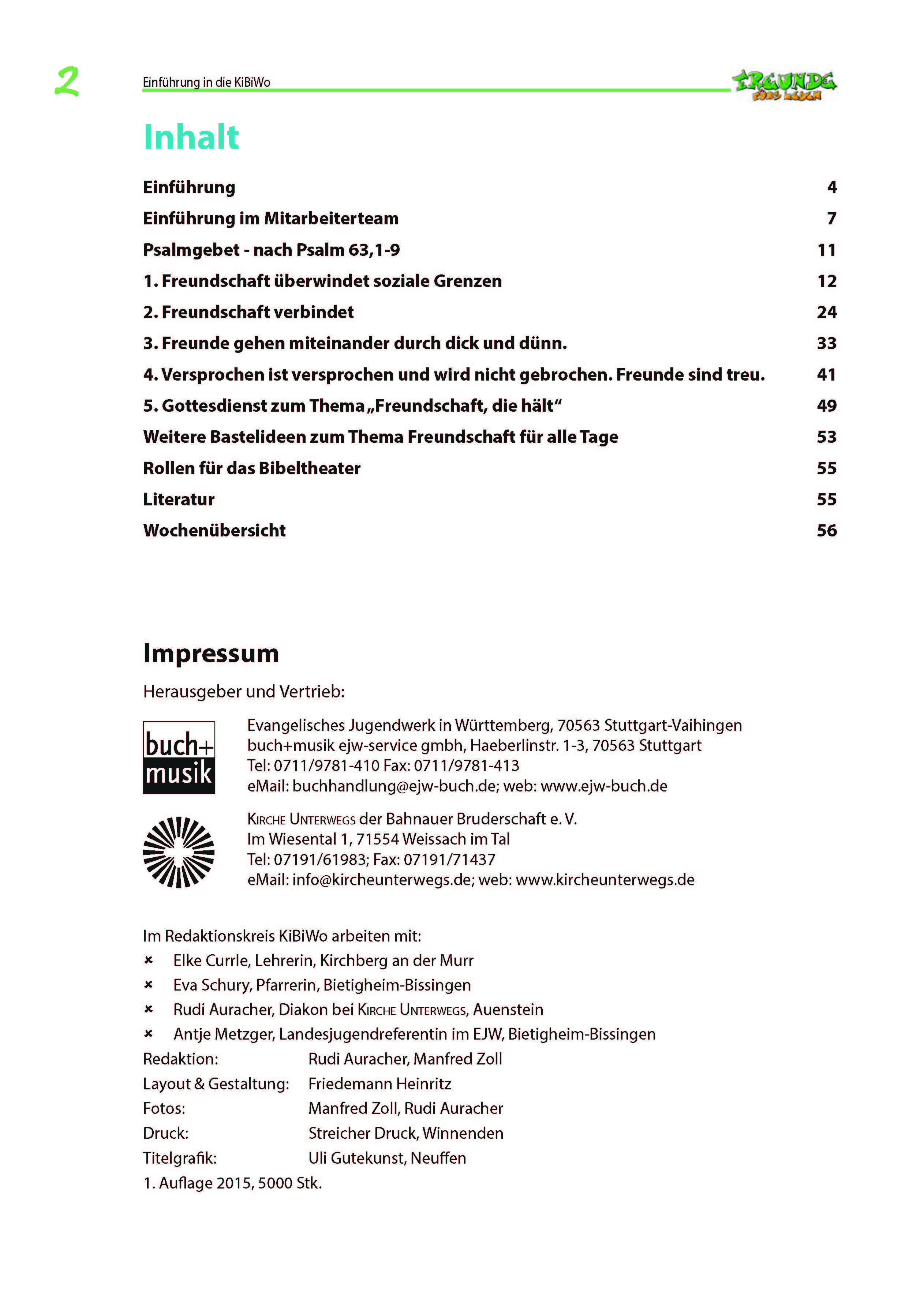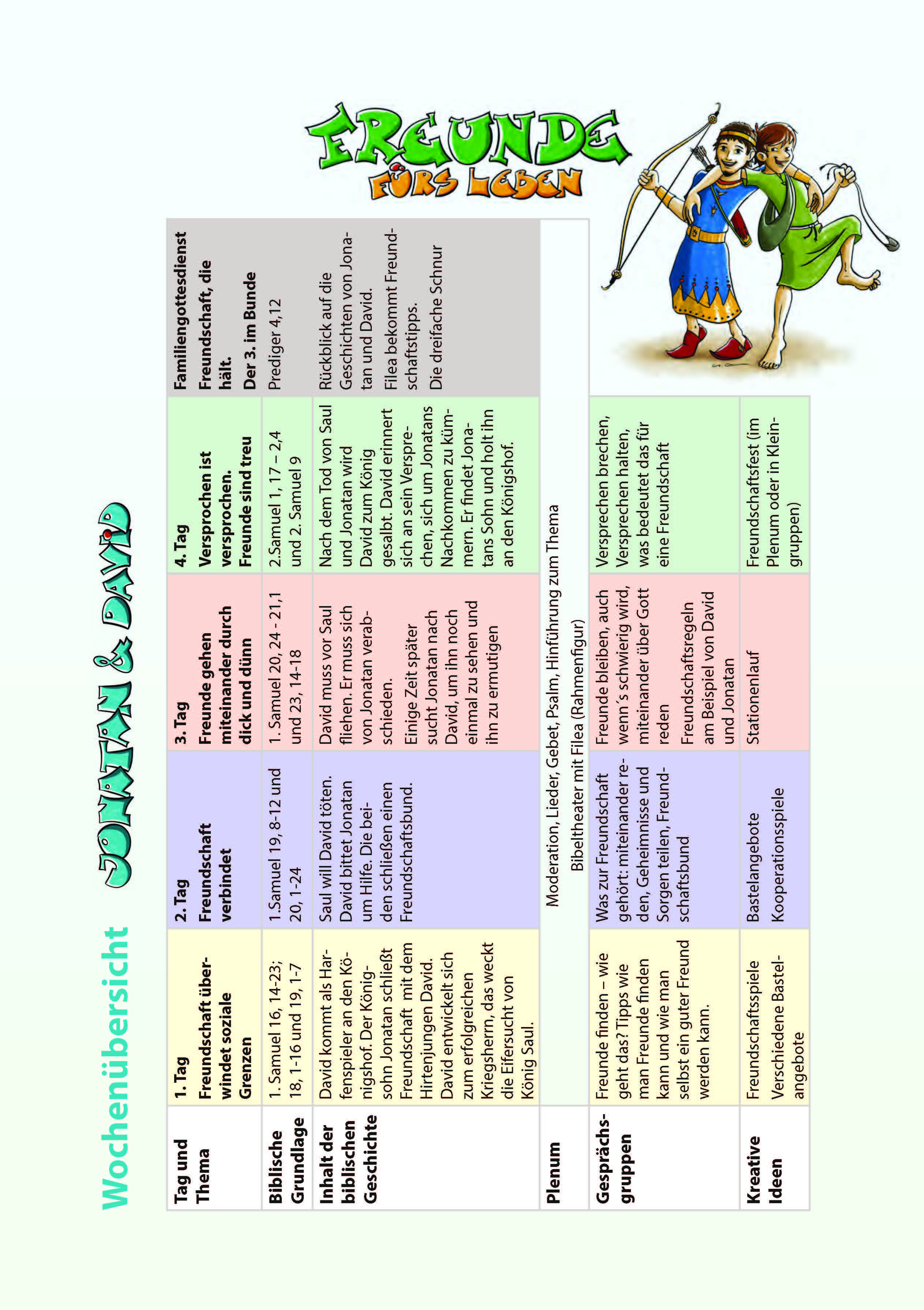Die KiBiWo "Freunde fürs Leben" erzählt die alttestamentliche Geschichte von Jonatan und David mit der Betonung ihrer Freundschaft nach. Die Abschnitte und Themen sind: