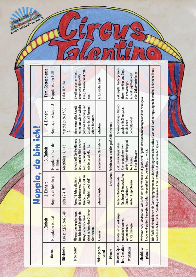 Die neue Arbeitshilfe der „Christlichen Zirkusschule“ enthält fünf Einheiten, die aber auch einzeln oder in kleiner Häppchen kombiniert werden können. Neben den Theaterstücken ist eine Rollenbeschreibung mit dabei sowie grundlegende Einführungen in das Konzept und die biblischen Geschichten.
