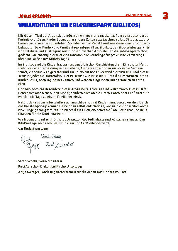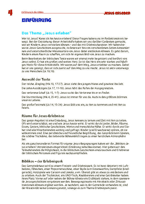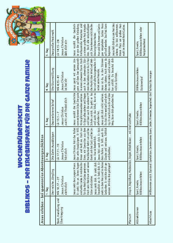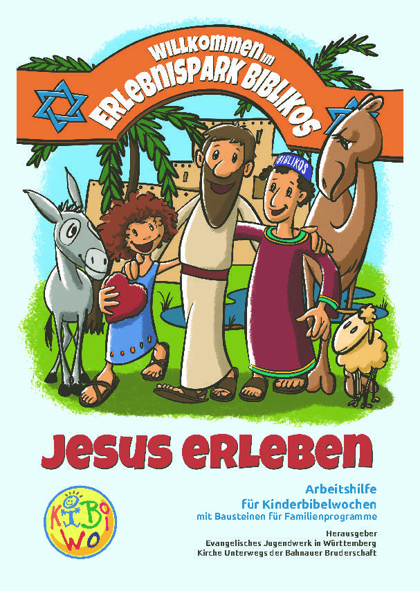 Jesus erleben – der Titel der neuen Arbeitshilfe für Kinderbibelwoche ist Programm. Kinder und ihre Eltern werden zu einem besonderen Freizeitvergnügen eingeladen: Dem Erlebnispark Biblikos. Der Parkwächter Ariel und die Parkbesucherin Maike begleiten die Gäste durch den Park. Dort können die Gäste in der Kulisse des Bibelerlebnisparks die Rahmenhandlung und die inszenierten biblischen Geschichten erleben und können zugleich selbst viel spielen, basteln, ausprobieren. Ein echtes Freizeitvergnügen für die ganze Familie eben.