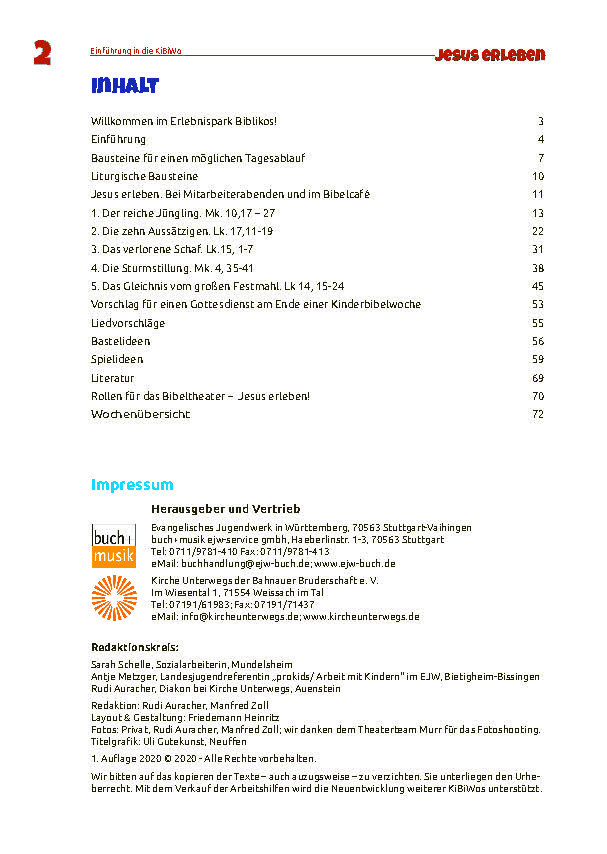 Die Arbeitshilfe umfasst fünf ausgearbeitete Programmentwürfe, eine Idee für einen Familiengottesdienst, viele Bastel- und Spielvorschläge, sowie Anregungen für die Gestaltung einer Drop-in-Phase. Sie umfasst 72 Seiten.
