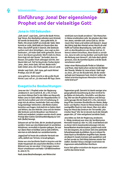 Jona erhält von Gott einen Spezialauftrag. Er soll der assyrischen Weltmetropole Ninive eine Botschaft von Gott ausrichten. Ausgerechnet Ninive, der feindlichen Hauptstadt, in der die Leute streiten, gemein zueinander sind und sich gegenseitig ausnehmen. Ihnen soll Jona sagen, dass Gott nicht länger ihrer Bosheit zuschauen wird. Er will Ninive zerstören und das Böse ausrotten. Doch Jona hat Angst. Angst vor Ninive und Angst vor der Güte Gottes. Darum beschließt er abzuhauen. Übers Meer. Nach Spanien. Doch weit kommt er nicht. Ein Sturm zieht auf. Es wird gefährlich. Da erfährt die Geschichte eine unterwartete Wendung …