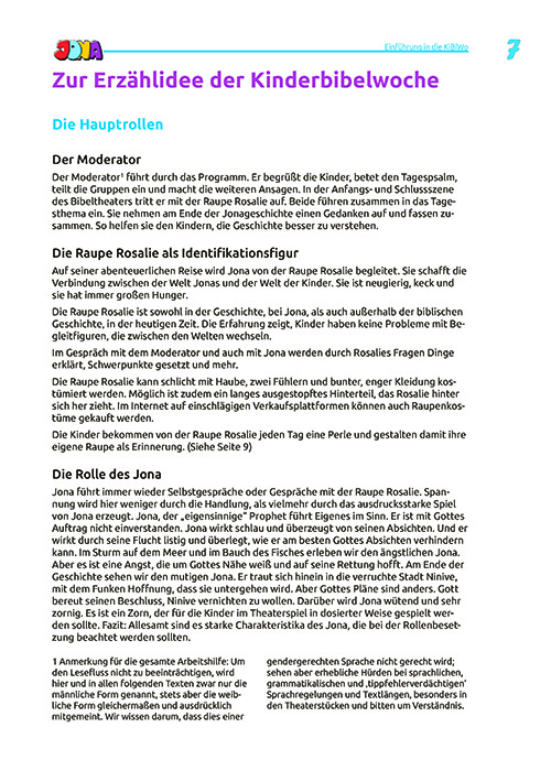 Raupe Rosalie begleitet die Jona-Geschichte. Sie entdeckt durch Jona Gott auf vielfältige Weise. Sie erlebt vor allem, dass Gottes Güte viel größer als sein Zorn ist und Gott retten und nicht bestrafen möchte. So umrahmen Rosalies Fragen und Entdeckungen Jona und verbindet seine Geschichte mit dem Leben der Kinder.