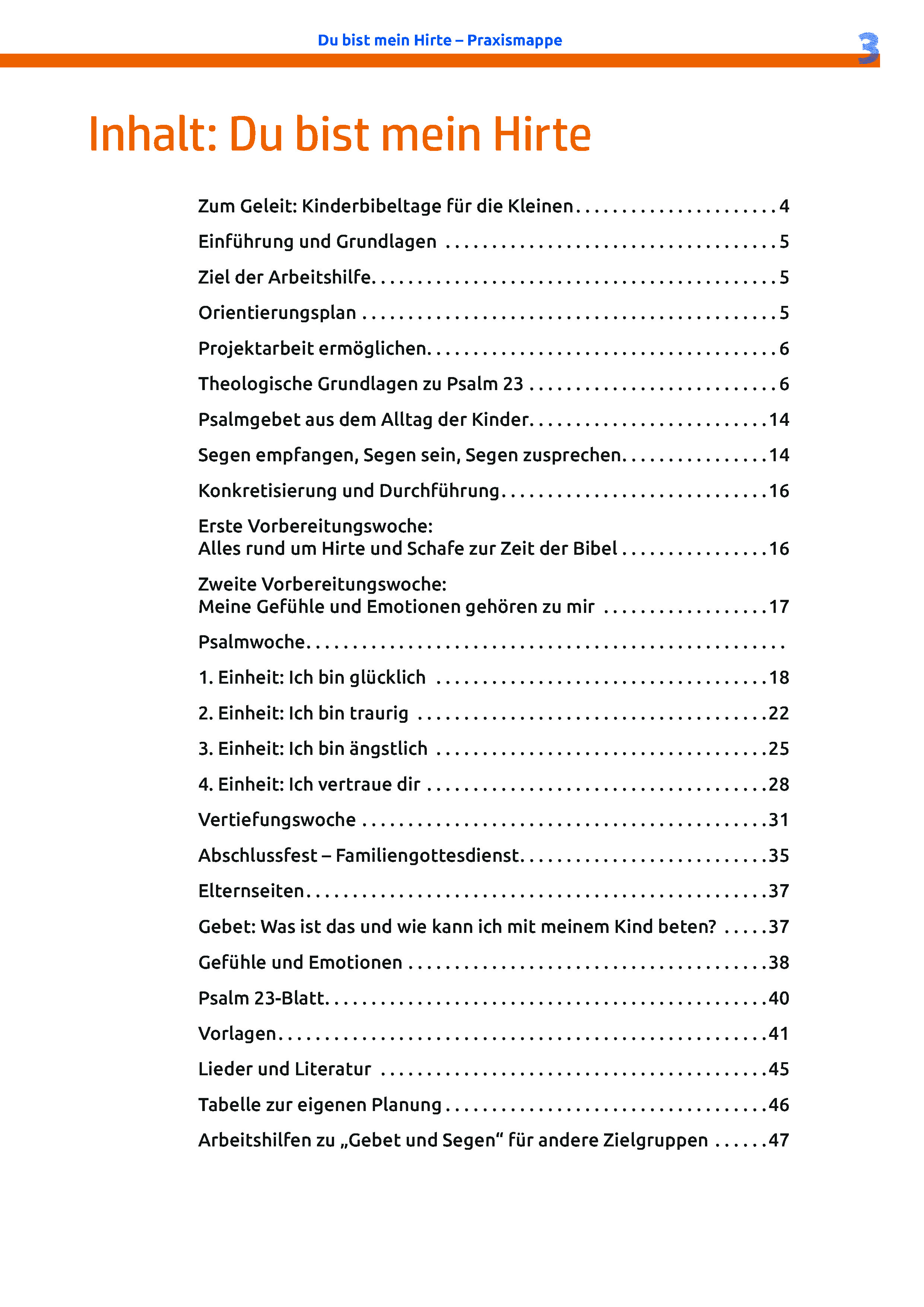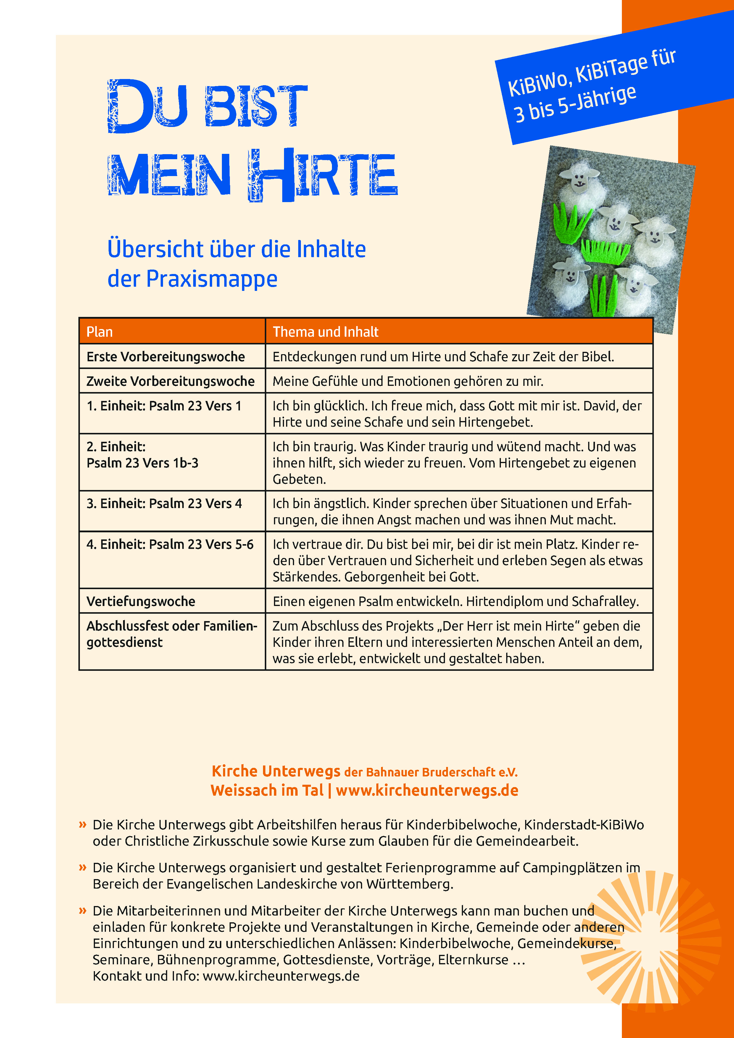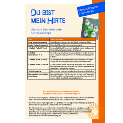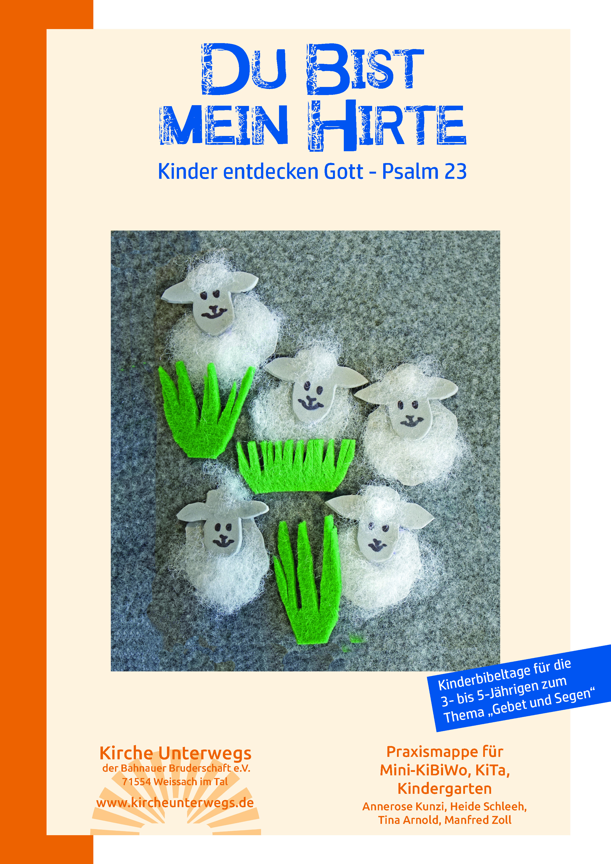 Diese Praxismappe ist speziell für die Kleinen und bietet auf sie zugeschnittene Methoden und Arbeitsformen. Das Heft mit dem Titel „Du bist mein Hirte“ wurde in Zusammenarbeit mit zwei erfahrenen Erzieherinnen geschrieben und entworfen. Damit kann man das Programm für die Kleinen bei der Kinderbibelwoche gestalten aber auch in Kindergarten oder KiTa Projektwochen durchführen. Geschichten, Bilder, kreative und erlebnishafte Elemente bieten den Kindern ganz elementare und auf sie zugeschnittene Zugänge zu Gebet und Segen, eröffnen ihnen Erlebnisräume und machen sie vertraut mit für sie geeigneten Formen von Gebet und Segen.