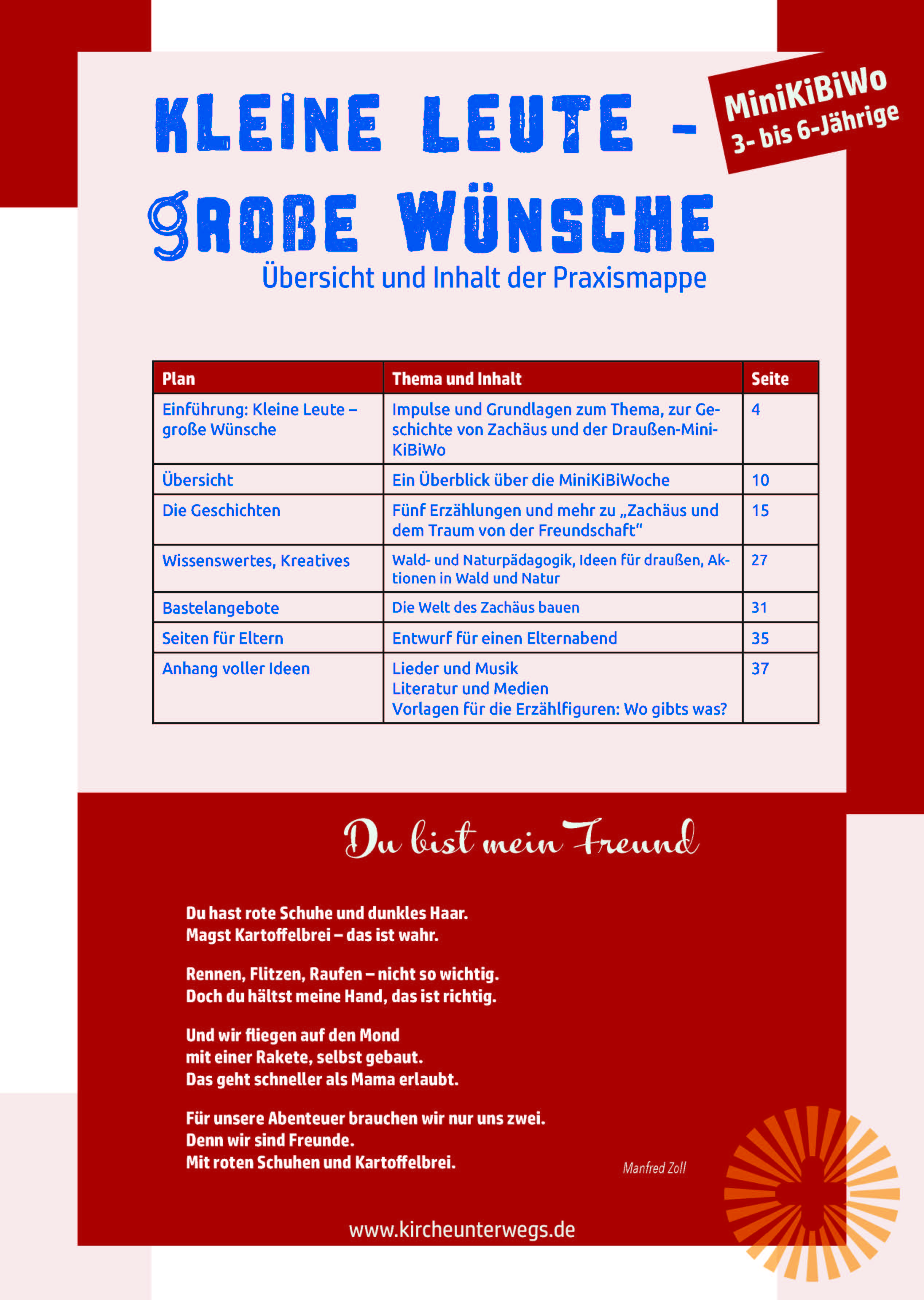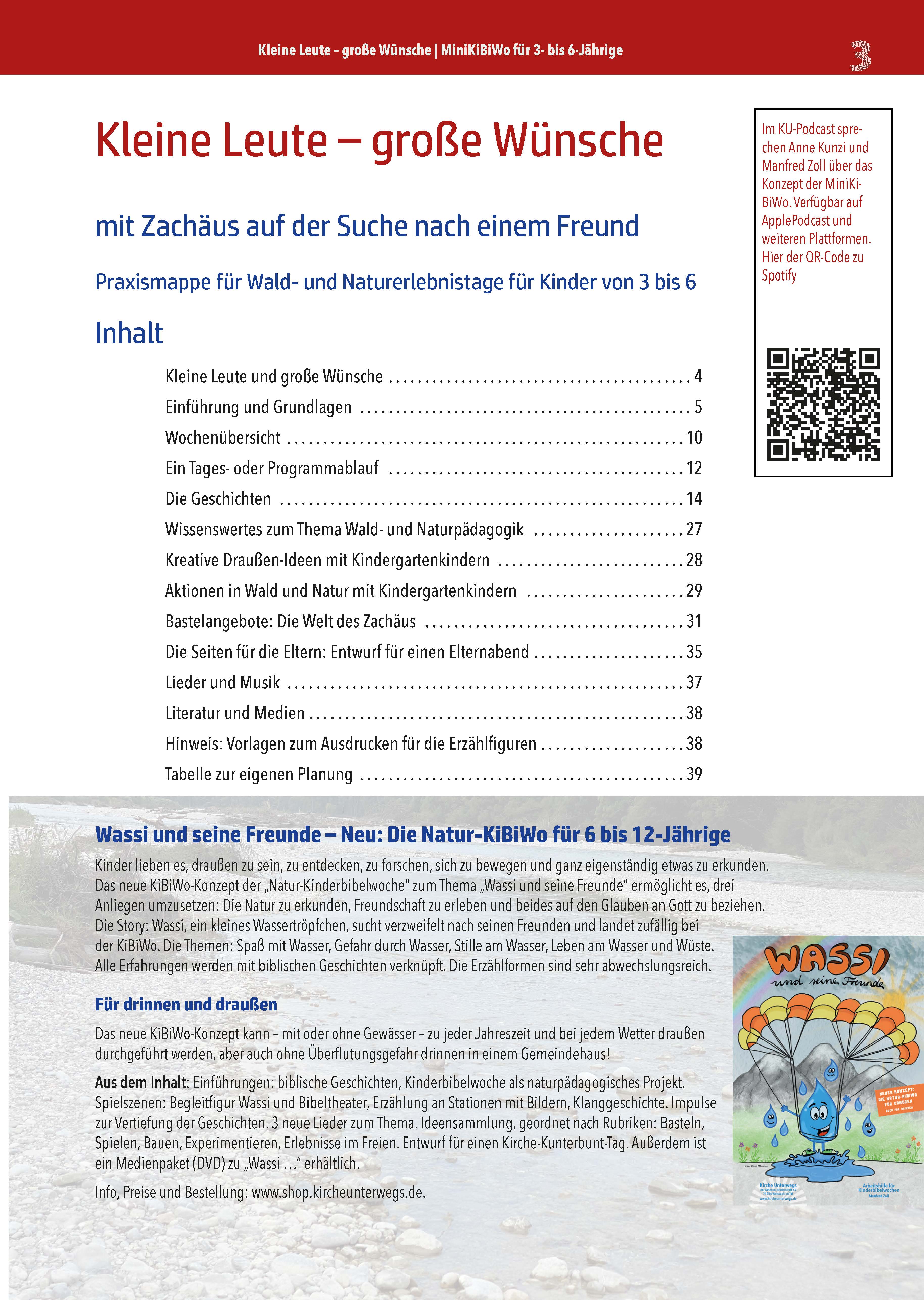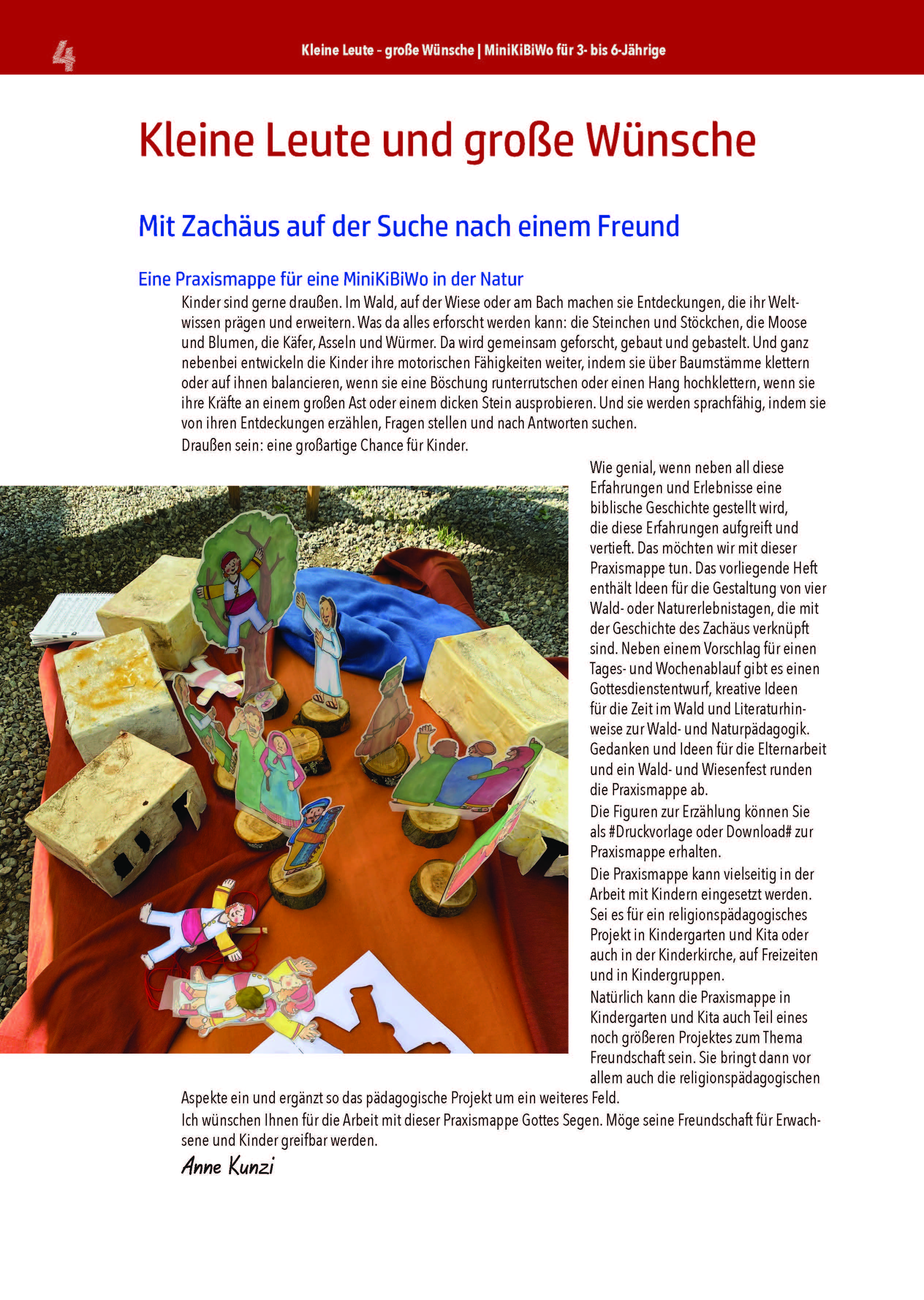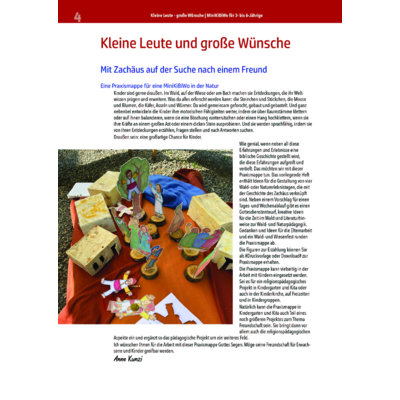 Das Konzept der neuen Natur-MiniKiBiWo ermöglicht genau dies: Kinder erkunden die Natur, erleben Freundschaft und beziehen beides auf den Glauben an Gott. Dabei lernen sie Zachäus kennen. Er ist klein. Mit klein sein kennen sich Kindergartenkinder aus. Er gehört nicht dazu und sucht doch einen Freund – auch damit haben 3 bis 6-jährige ihre Erfahrungen. Und dann begegnet ihm Jesus … Die große Veränderung, die das für Zachäus mit sich bringt, bringt uns zum Staunen und Nachdenken.