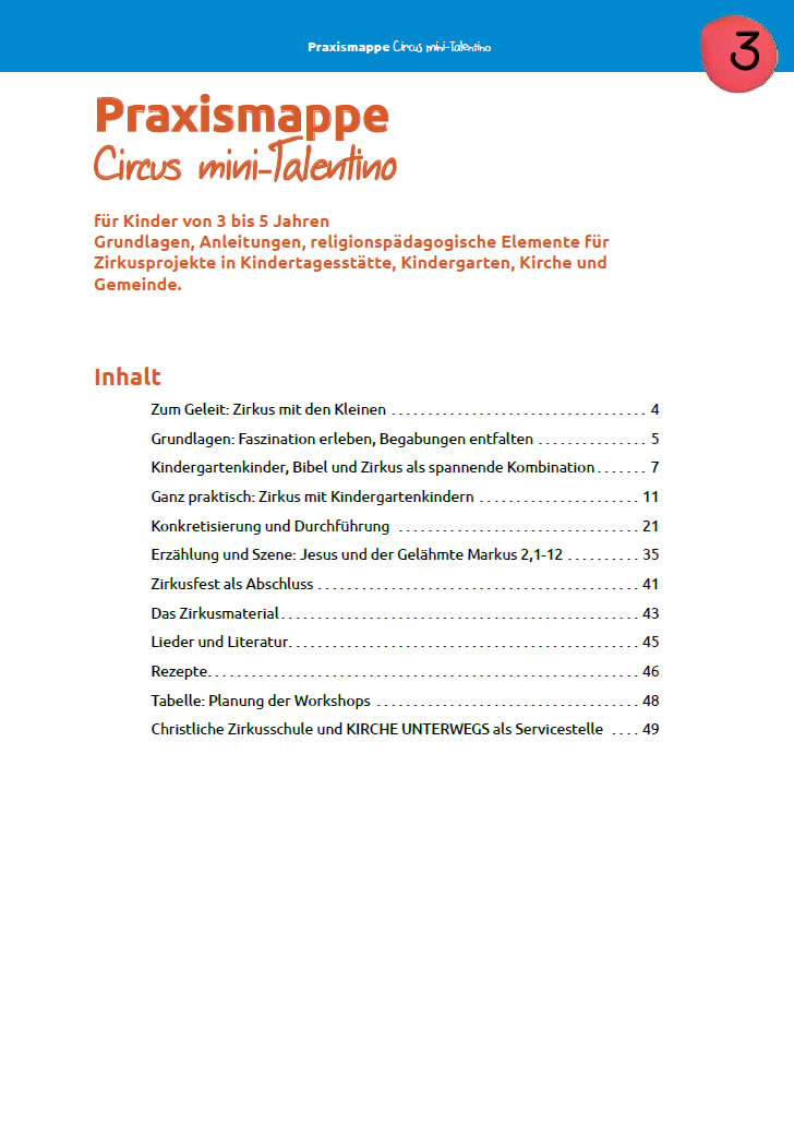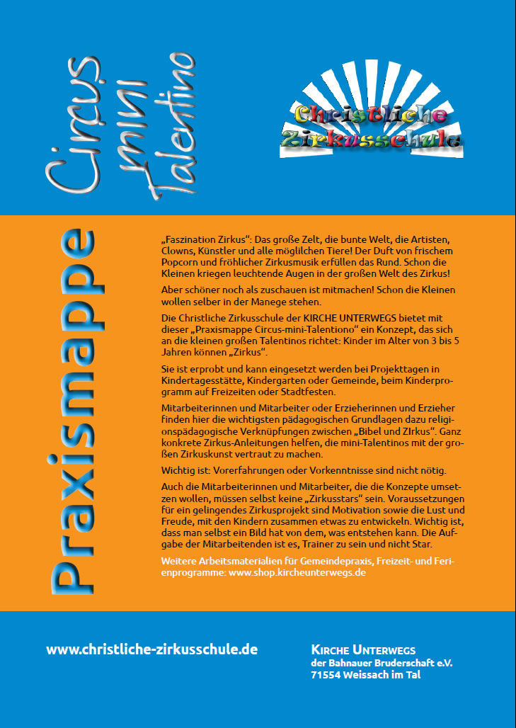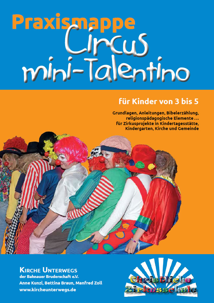 Die Christliche Zirkusschule der KIRCHE UNTERWEGS bietet mit dieser „Praxismappe Circus-mini-Talentiono“ ein Konzept, das sich an die kleinen großen Talentinos richtet: Kinder im Alter von 3 bis 5 Jahren können „Zirkus“. Sie ist erprobt und kann eingesetzt werden bei Projekttagen in Kindertagesstätte, Kindergarten oder Gemeinde, beim Kinderprogramm auf Freizeiten oder Stadtfesten.