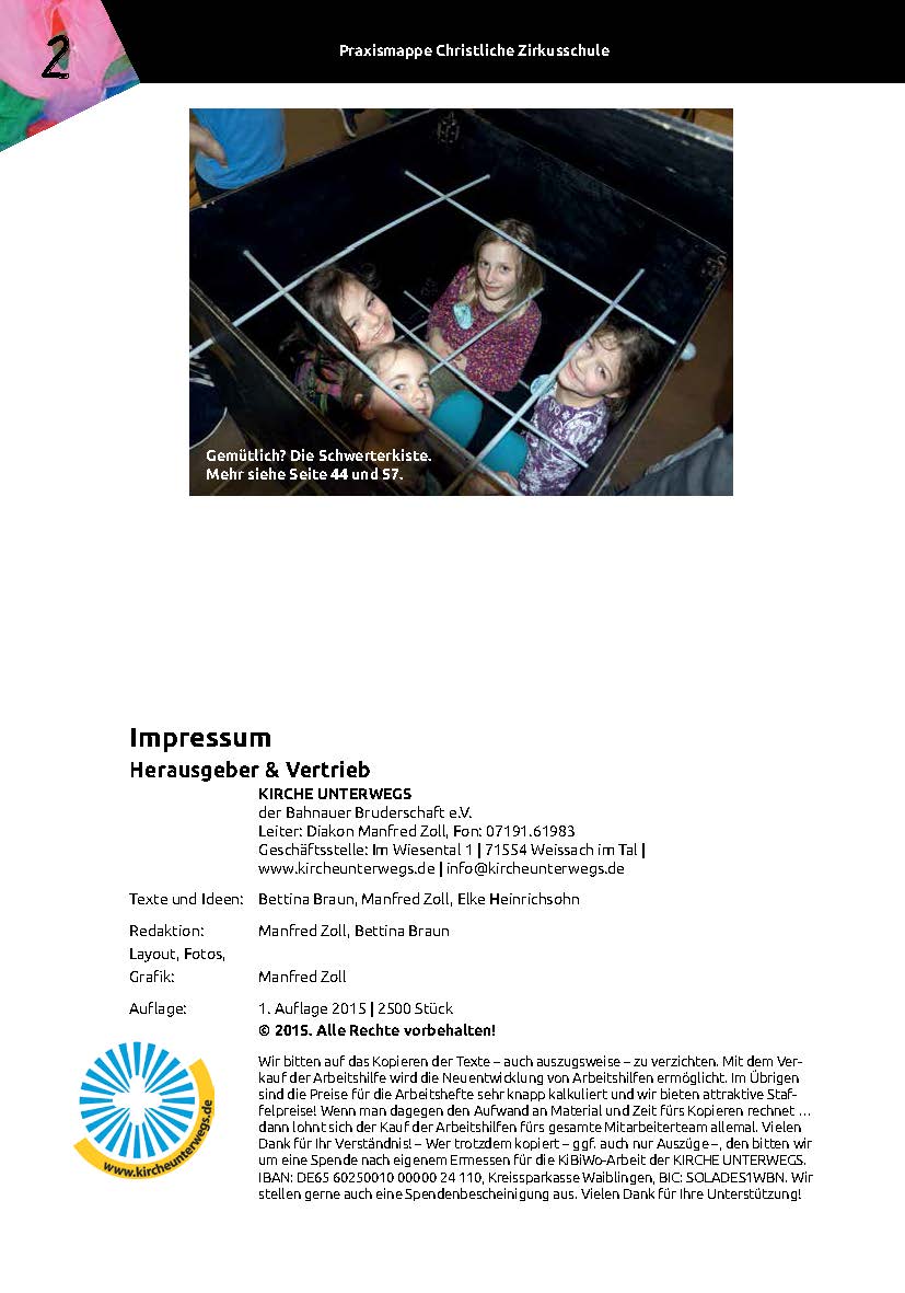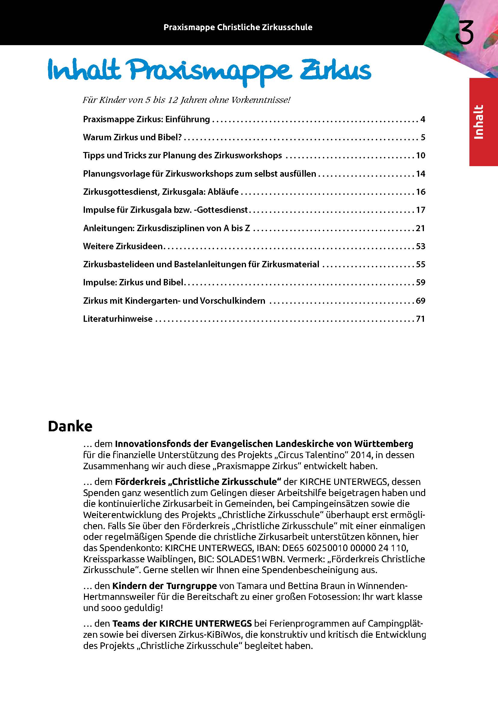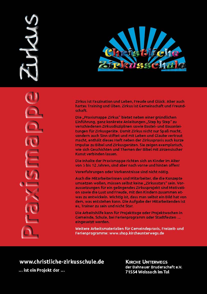 Die Praxismappe Zirkus liefert für Zirkusprojekte in Gemeinde, Schule, Freizeit oder Ferienprogramm ebenso wie für regelmäßige Zirkusgruppen jede Menge erprobte Ideen und Tipps für eine erfolgreiche Zirkusarbeit mit Kindern. Sie führt ein in die Idee der Christlichen Zirkusschule, vermittelt Basics der Zirkuspädagogik, bietet jede Menge Planungs- und Organisationshilfen für Zirkusworkshops und -aufführungen, erläutert wie Kinder bei Zirkusdisziplinen angeleitet werden können und stellt konkrete Beispiele von biblischer Verkündigung im Rahmen einer Zirkusarbeit vor. Die Praxismappe Zirkus versteht sich als Ergänzung zu unseren Arbeitshilfen mit inhaltlichen Programmentwürfen für Zirkustage und -wochen. Sie vermittelt grundlegende und weitreichende Hilfen für eine christliche Zirkusarbeit. Die „Praxismappe Zirkus“ richtet sich an Kinder von 5 bis ca. 12 Jahren.