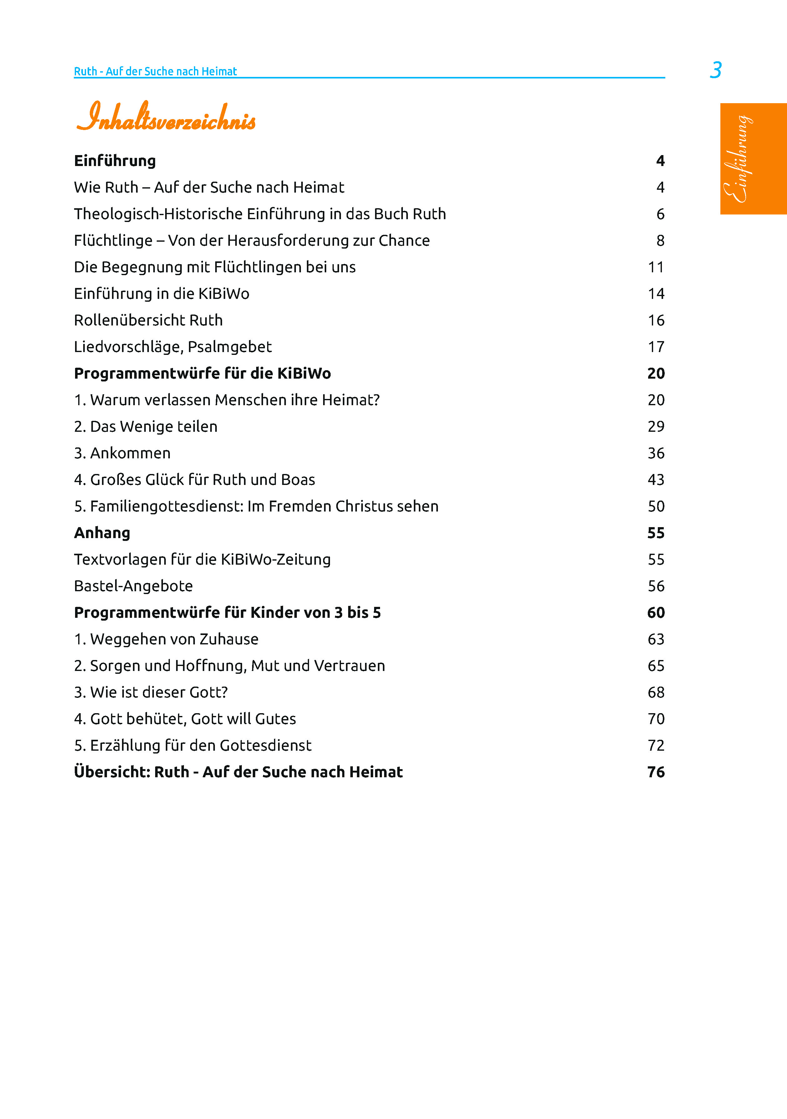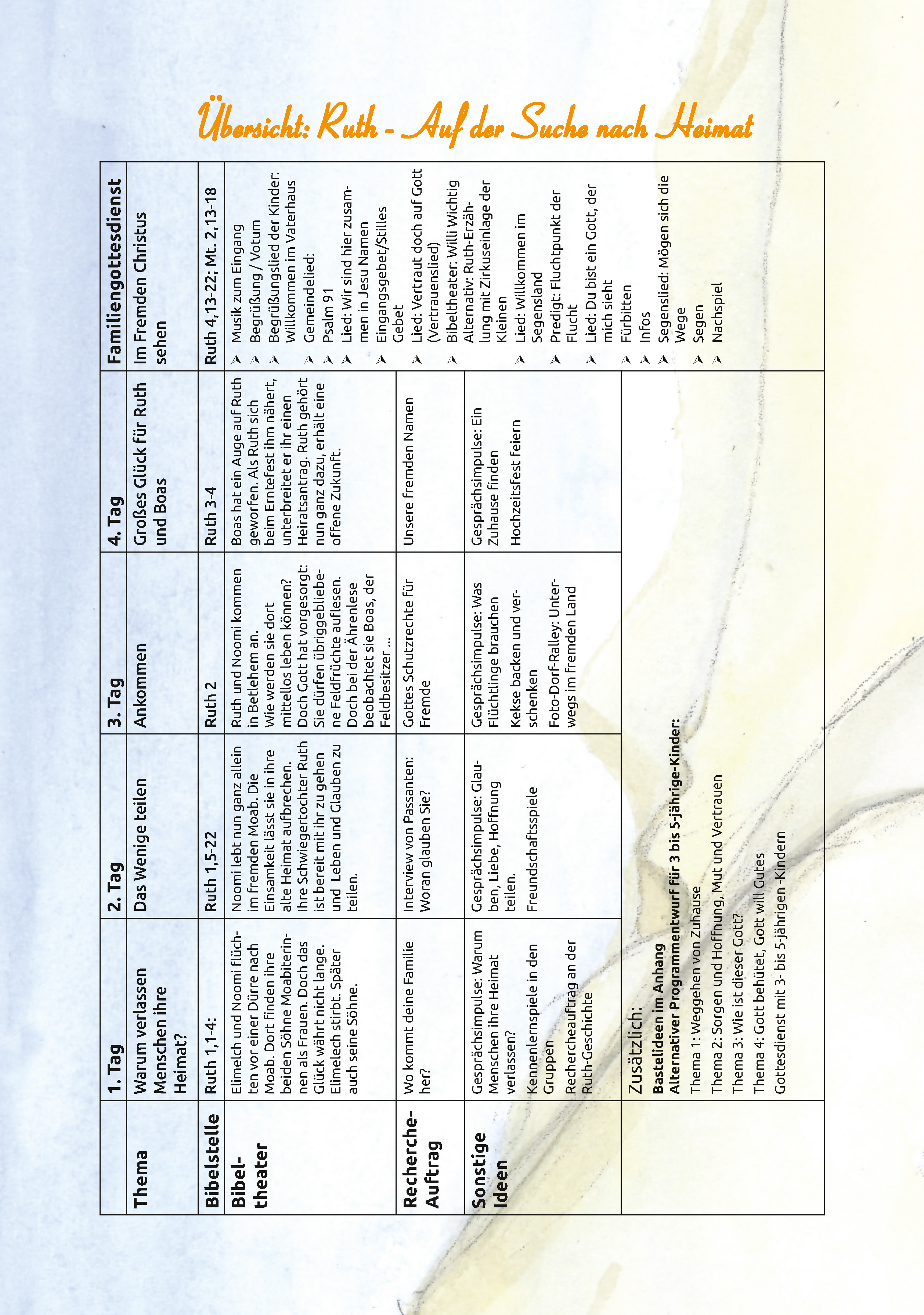 Die Praxismappe enthält zudem Überlegungen zur Situation von Fremden, zu Flucht und Vertreibung sowie eine theologische Einführung in das Buch Ruth.