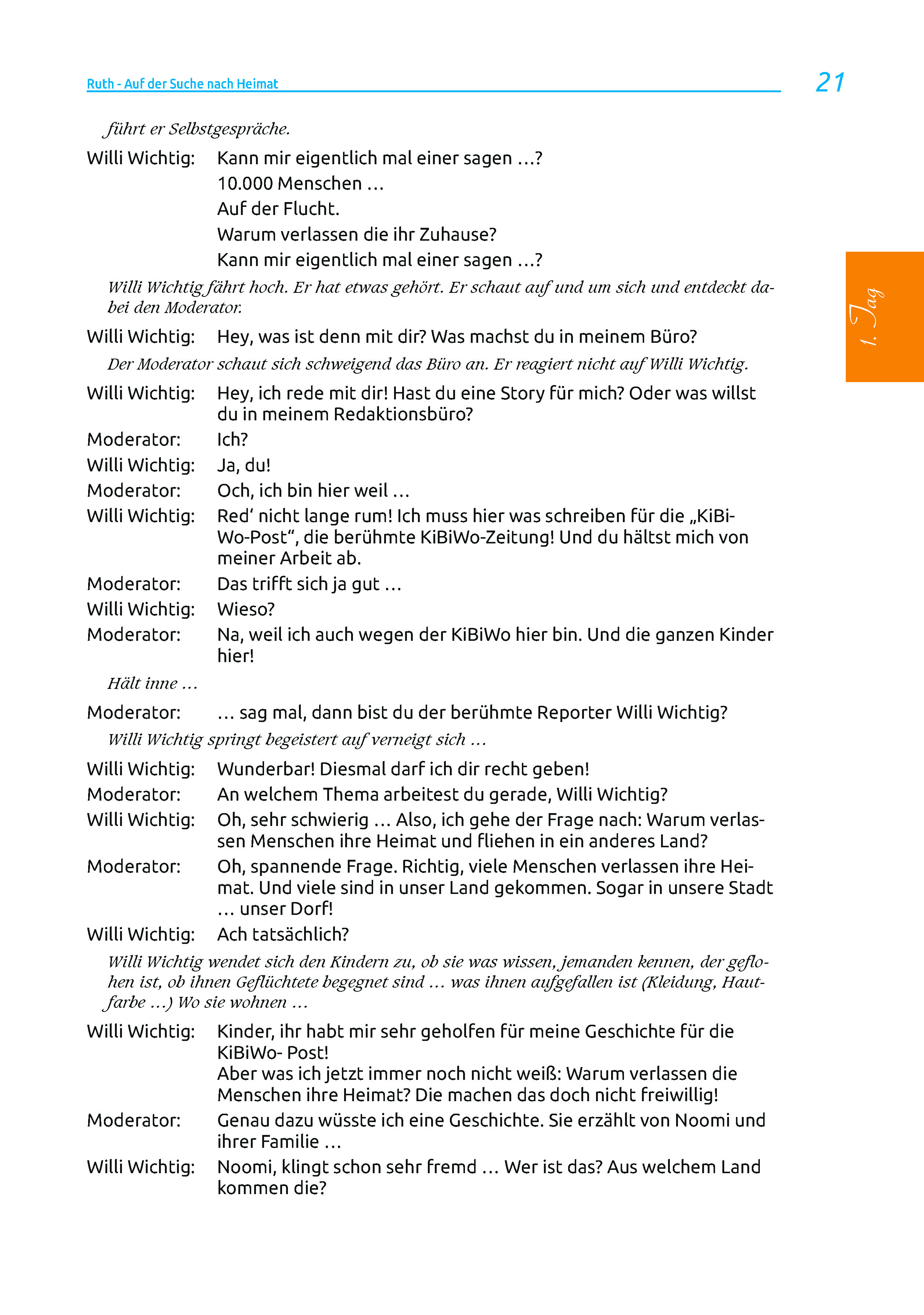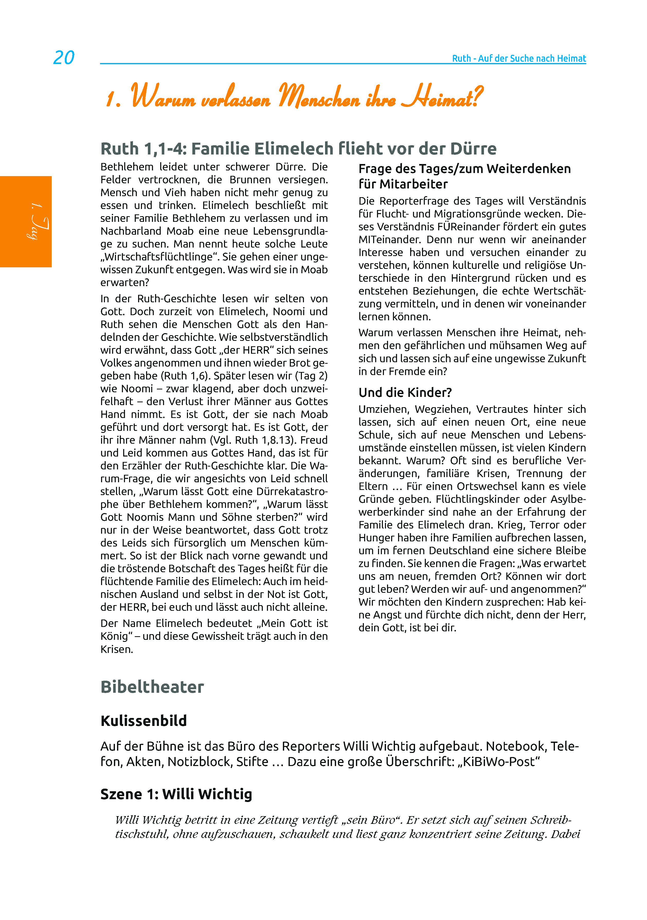 Reporter Willi Wichtig ist verwirrt. Vertieft in seine Tageszeitung betritt er sein Büro. „Tausende sind auf der Flucht“, liest er und murmelt vor sich hin: „Warum verlassen so viele Menschen ihre Heimat?“ Gemeinsam mit den Kindern entdeckt Willi Wichtig in der Geschichte von Noomi und Ruth, warum Menschen ihre Heimat verlassen, was ihnen Kraft gibt für einen neuen Anfang und was dabei hilft, dass Menschen eine neue Heimat finden. Die Ruth-Geschichte ist unspektakulär aber faszinierend, weil sie menschliches Miteinander und tief im Leben verwurzelten Glauben an Gott nahebringt. Und weil sie von menschlicher und göttlicher Fürsorge für Schwache, Bedürftige und Fremde erzählt. Und weil sie ermutigt Leben und Glauben miteinander zu teilen – bei hohem Respekt vor dem Fremden und Nächsten. Eine Geschichte, die für unsere Zeit wertvolles zu sagen hat.