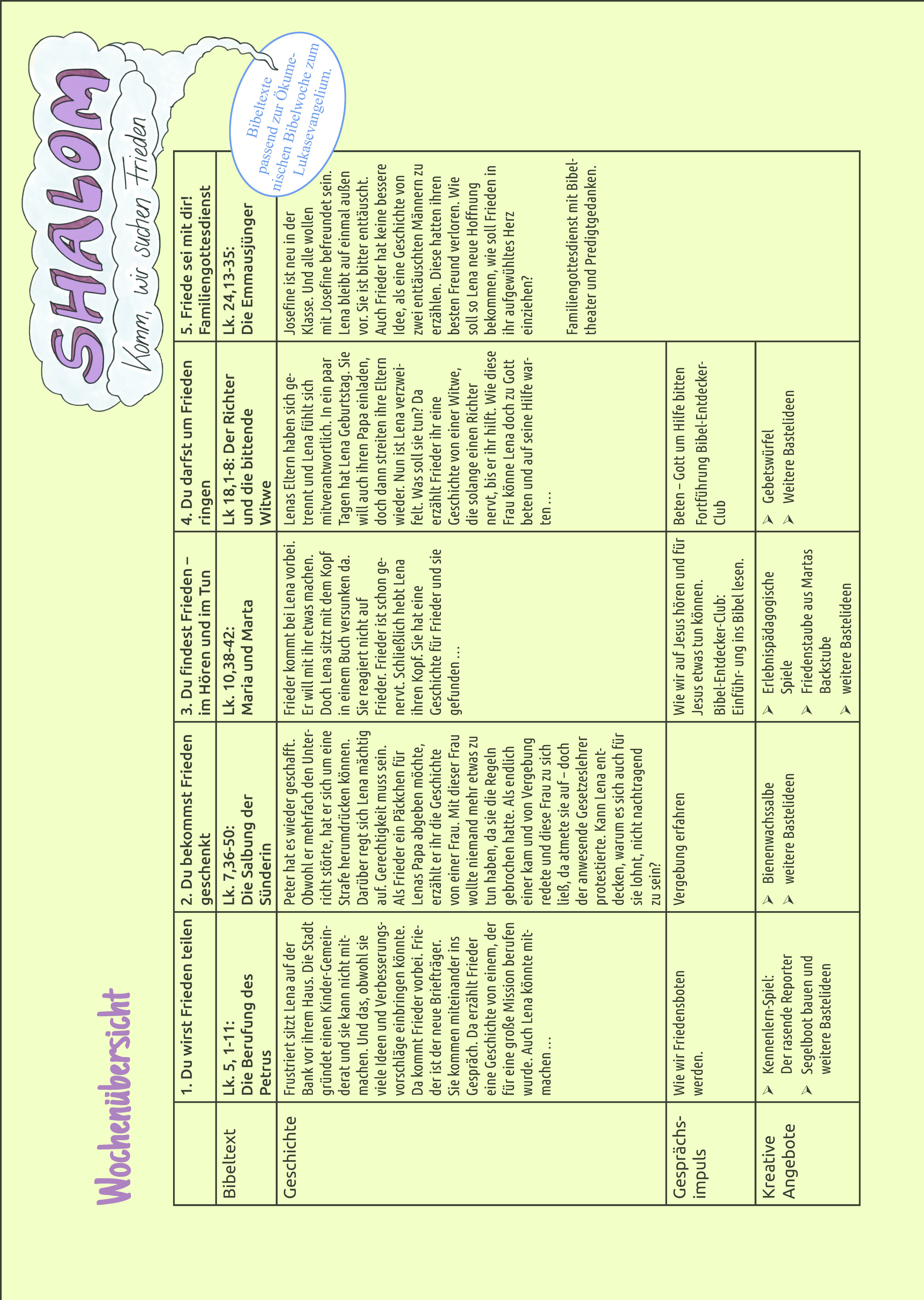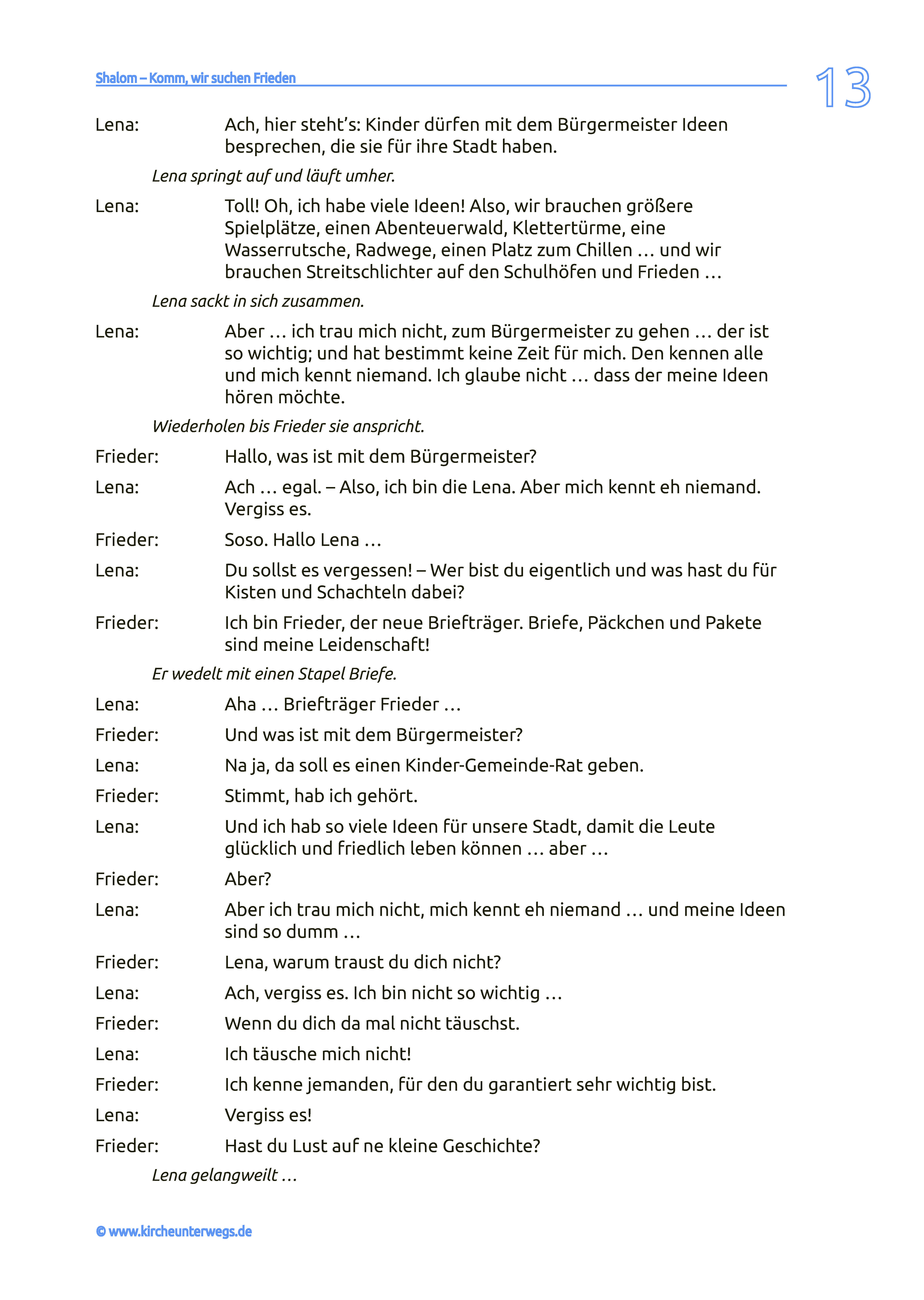 Frieder ist der neue Postbote und kommt täglich bei Lena vorbei. Meistens bringt er etwas Zeit mit und unterhält sich mit Lena, die ihm so ihre Probleme erzählt. Da Frieder sich in der Bibel super auskennt, fallen ihm immer wieder Geschichte ein, die Lena helfen könnten. Geschichten von Streit, oder besser: von Versöhnung und Frieden. Vor allem von Jesus ist Frieder beeindruckt. Er ist für ihn ein Friedensbote. Und tatsächlich: Sein Friede erreicht auch Lenas Herz.
