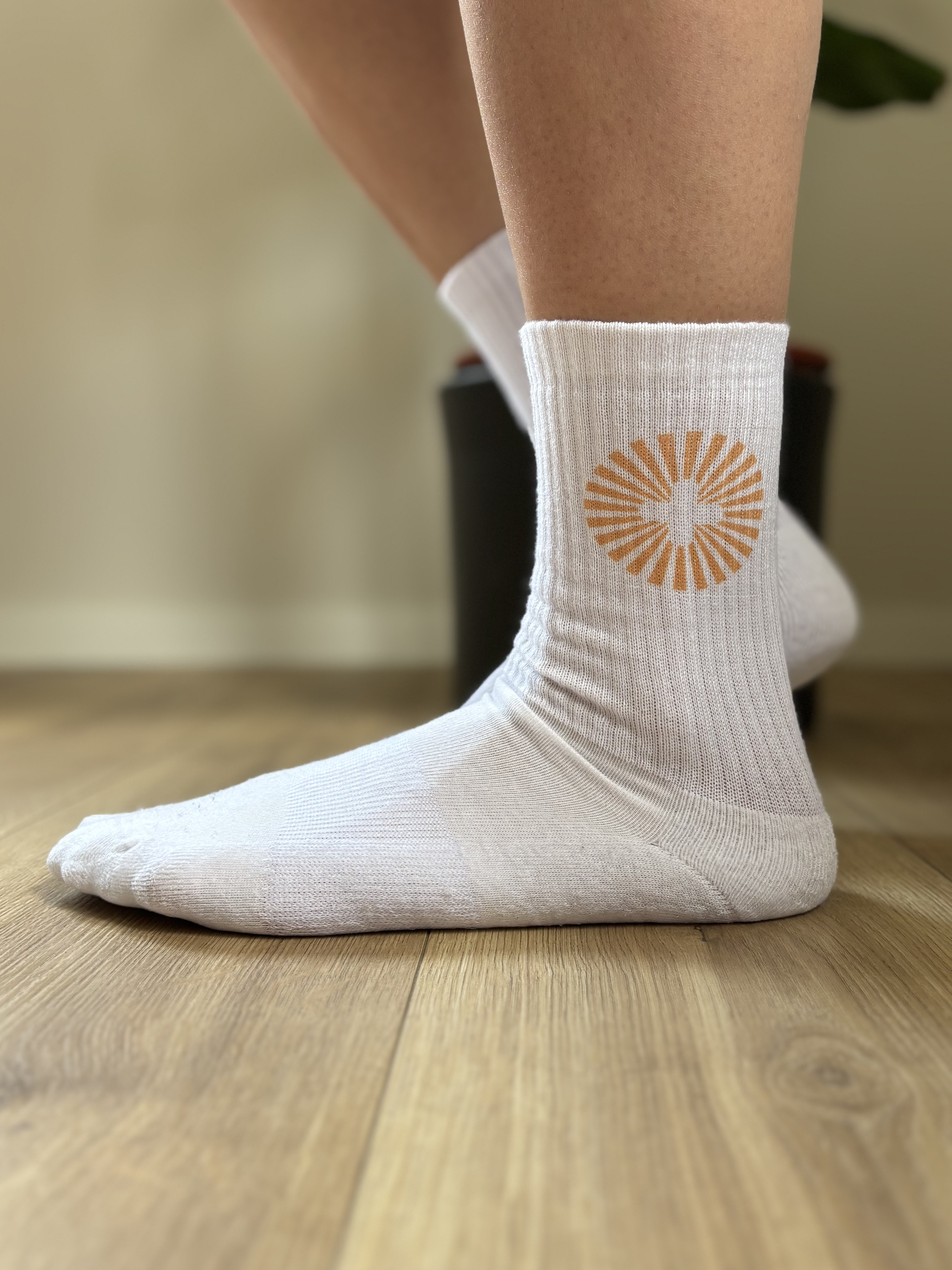 Weiße Tennissocken mit auffälligem, orangenem Sonnenkreuz-Print. (Größe 42-46)