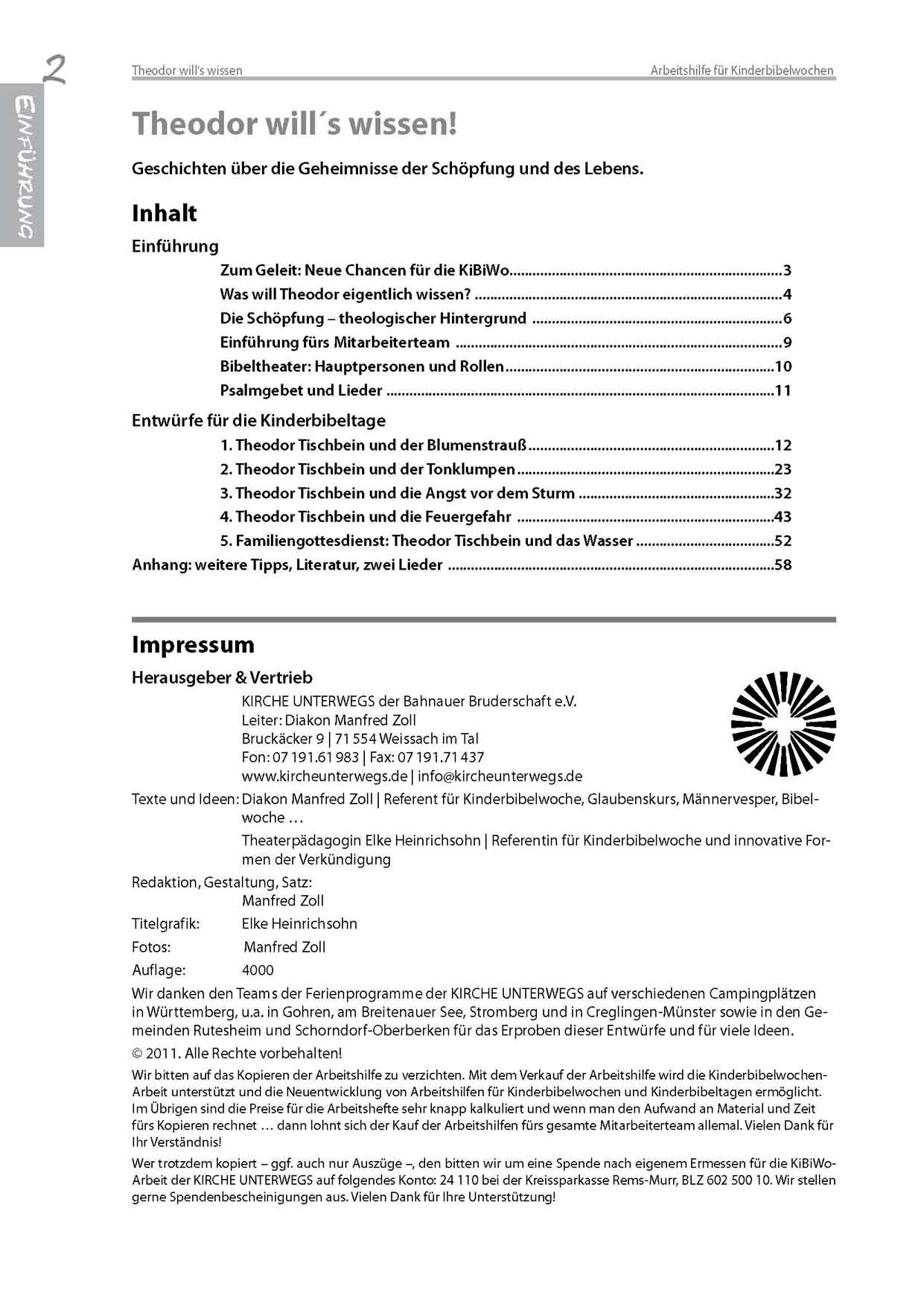 Die Arbeitshilfe für Kinderbibelwoche enthält Dialoge, Bibeltheaterszenen, liturgische Bausteine, Gesprächsimpulse, methodisch-didaktische und theologische Einführungen für Mitarbeiter, zirkuspädagogische Elemente, kreative Spiele und Experiemente für die Gruppen. Sie umfasst 60 A4-Seiten.
