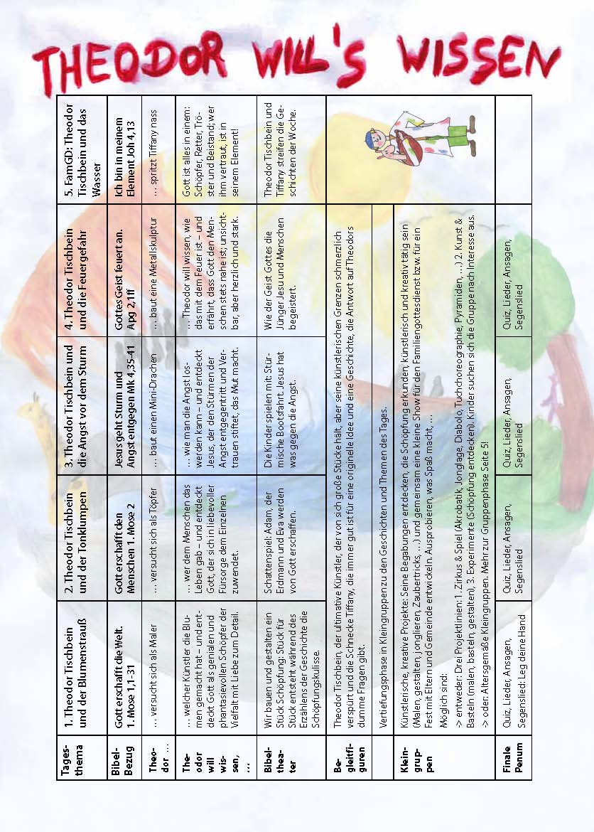 Mit Theodor gehen die Kinder auf Entdeckungsreise durch die Schöpfung und durch das Leben. In Zirkusspielen, beim künstlerischem Gestalten und durch Experimentieren vertiefen, erleben und probieren die Kinder aus, was sie in den Geschichten gehört haben. Das heißt: Geschichten und Kleingruppenaktivitäten korrespondieren in ganz besonderer Weise miteinander.