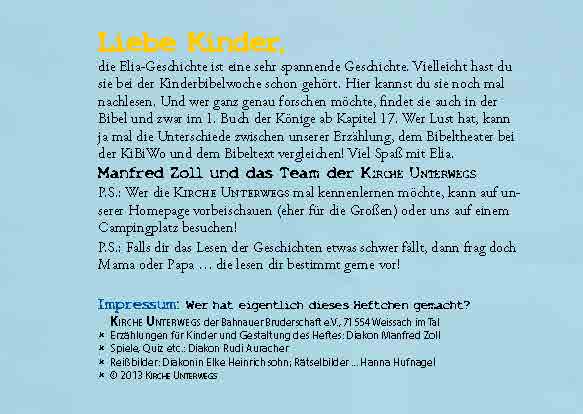Die Elia-Geschichte nacherzählt für Kinder mit Reißbildern, Rätseln, einem Elia-Lexikon und manchem mehr.