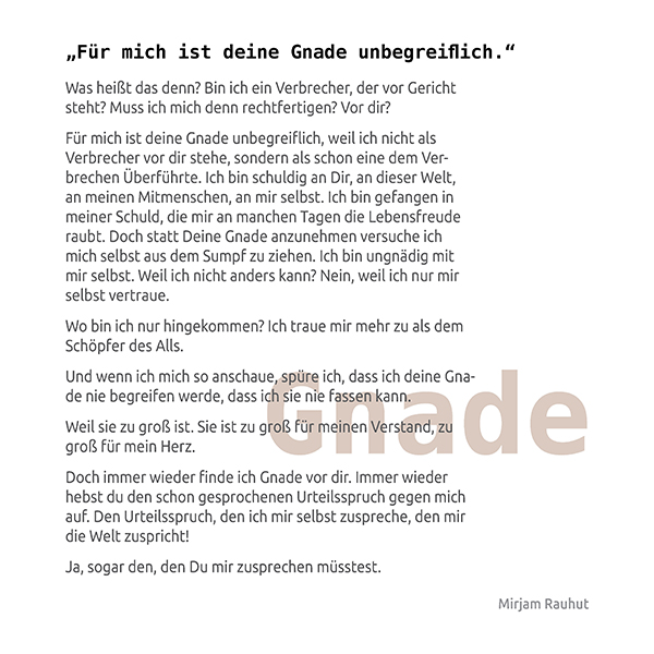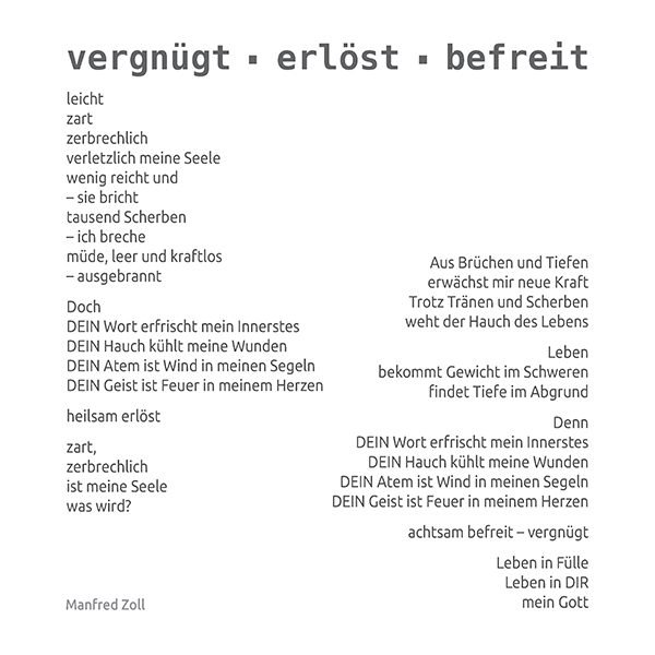 Das zwanzigseitige Heft mit kurzen Texten und Gedichten, die durch Bilder illustriert werden, eignet sich als Verteilheft für die Teilnehmenden von Glaubenskursen (insbesondere Reformationskurs) oder auch für Gottesdienste und andere Veranstaltungen. In den Texten und Bildern, die Manfred Zoll zusammen mit zwei Studentinnen von der Evangelischen Missionsschule Unterweissach entwickelt hat, geht es um Schönheit, Zweifel, unbegreifliche Gnade oder leere und gefüllte Worte.