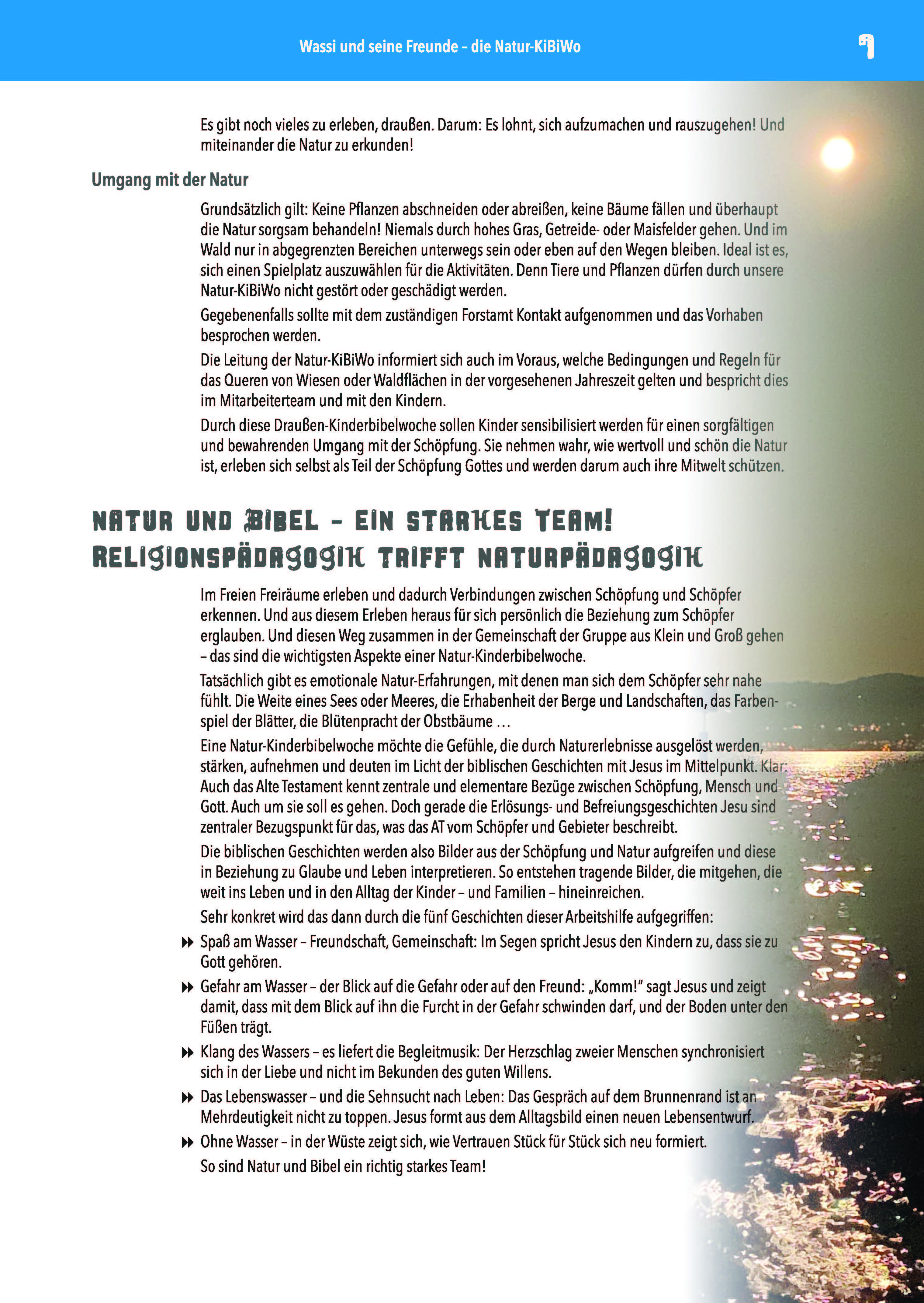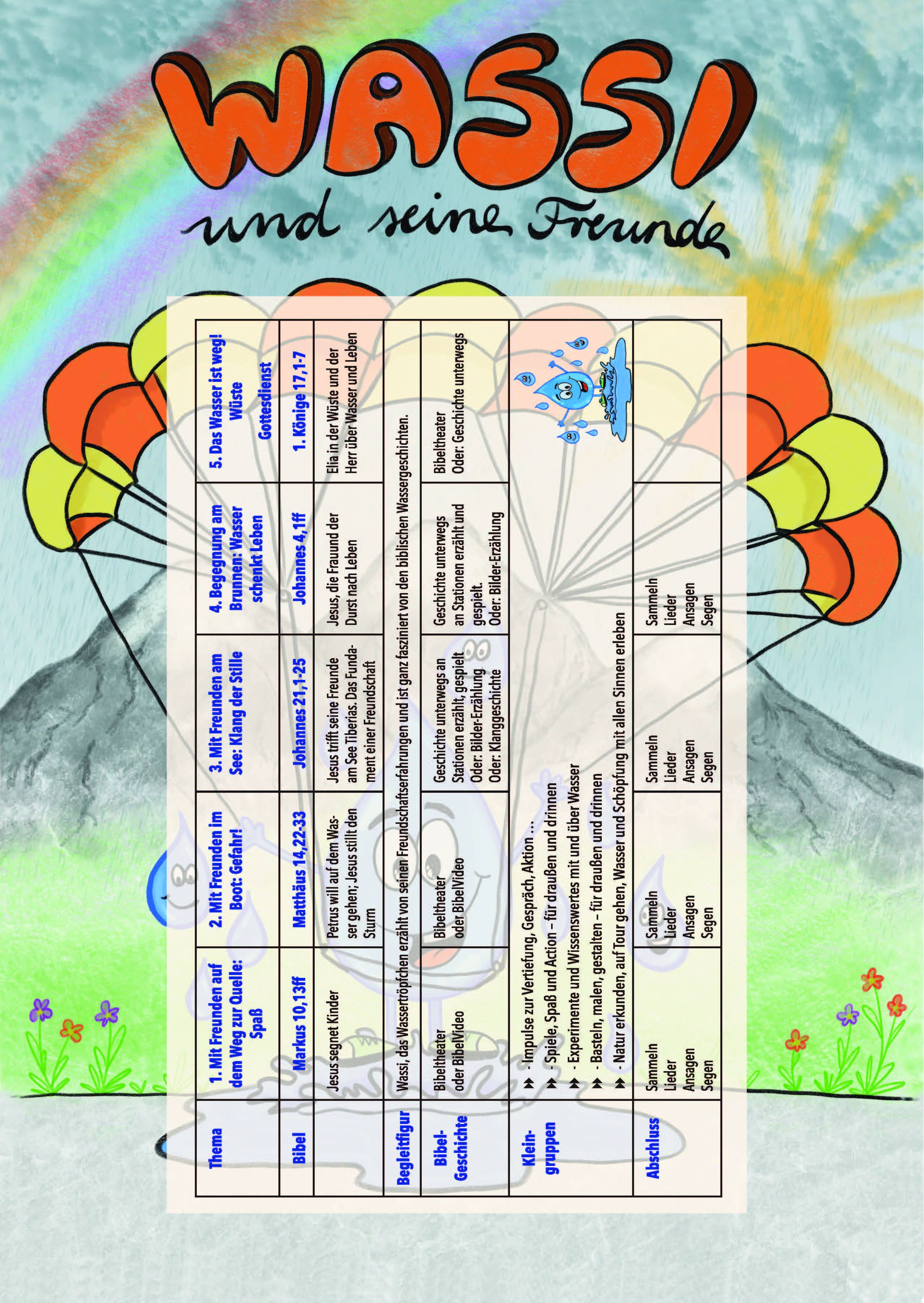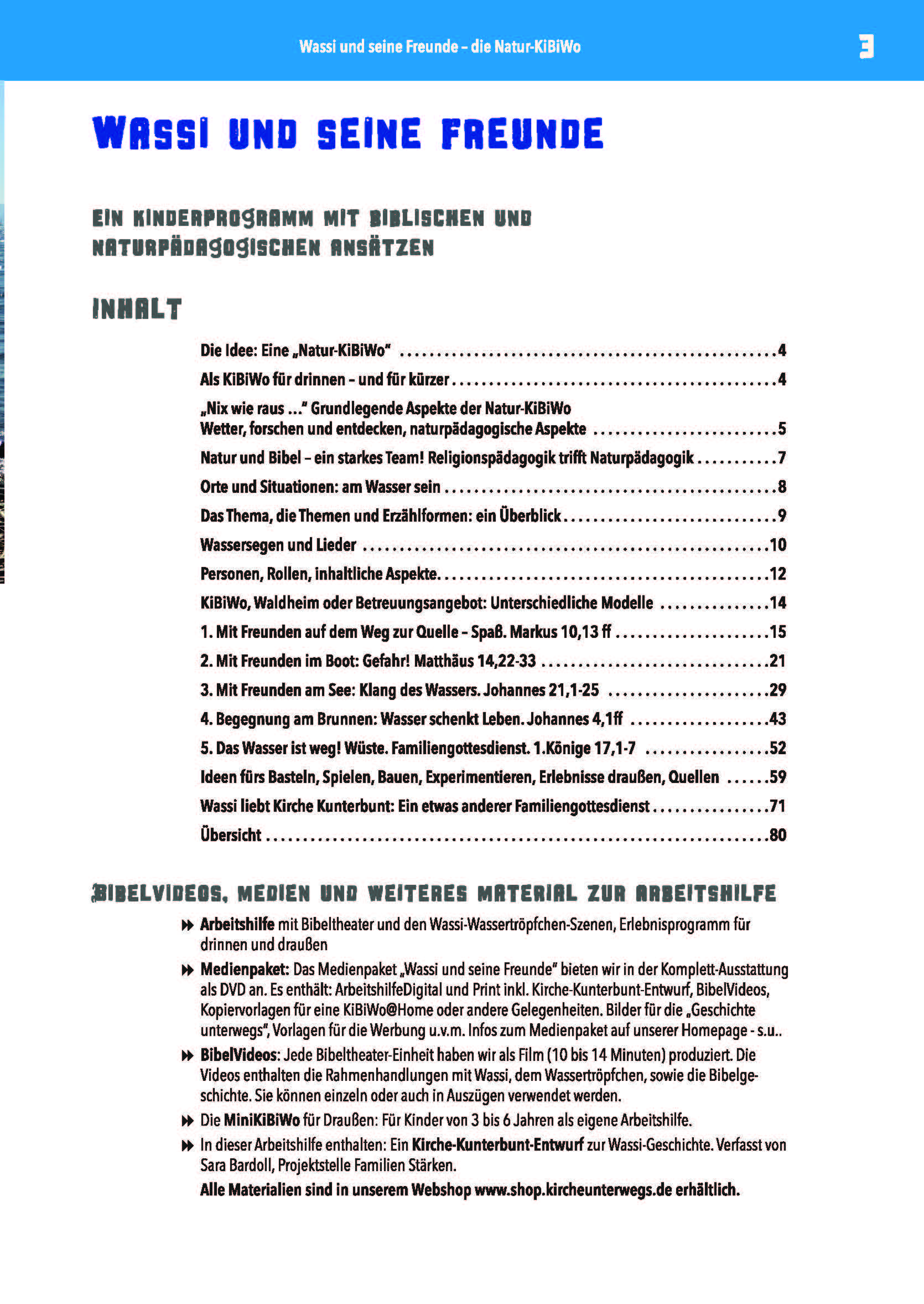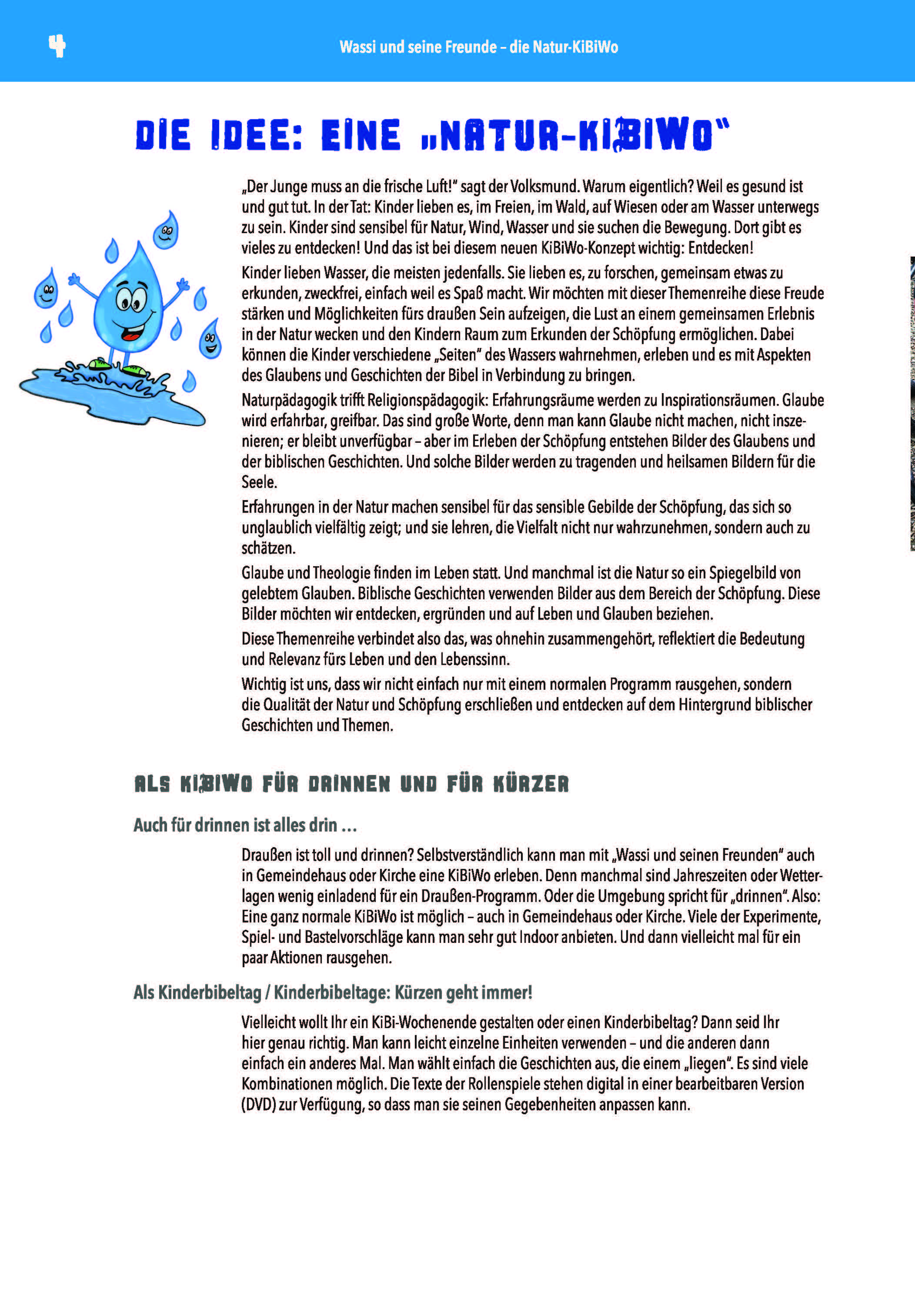 Die Story: Wassi, ein kleines Wassertröpfchen, sucht verzweifelt nach seinen Freunden und landet zufällig bei der KiBiWo. Und dabei geht es um fünf Erlebnisse, die für ein Wassertröpfchen wichtig sind: Spaß mit Wasser, Gefahr durch Wasser, Stille am Wasser, Leben am Wasser und Wüste: Das Wasser ist weg! Alle Erfahrungen werden mit biblischen Geschichten verknüpft, so dass Erlebnis und Glaube in eine enge Beziehung zueinander gelangen. Die Erzählformen sind sehr abwechslungsreich und auf eine Draußen-KiBiWo abgestimmt.