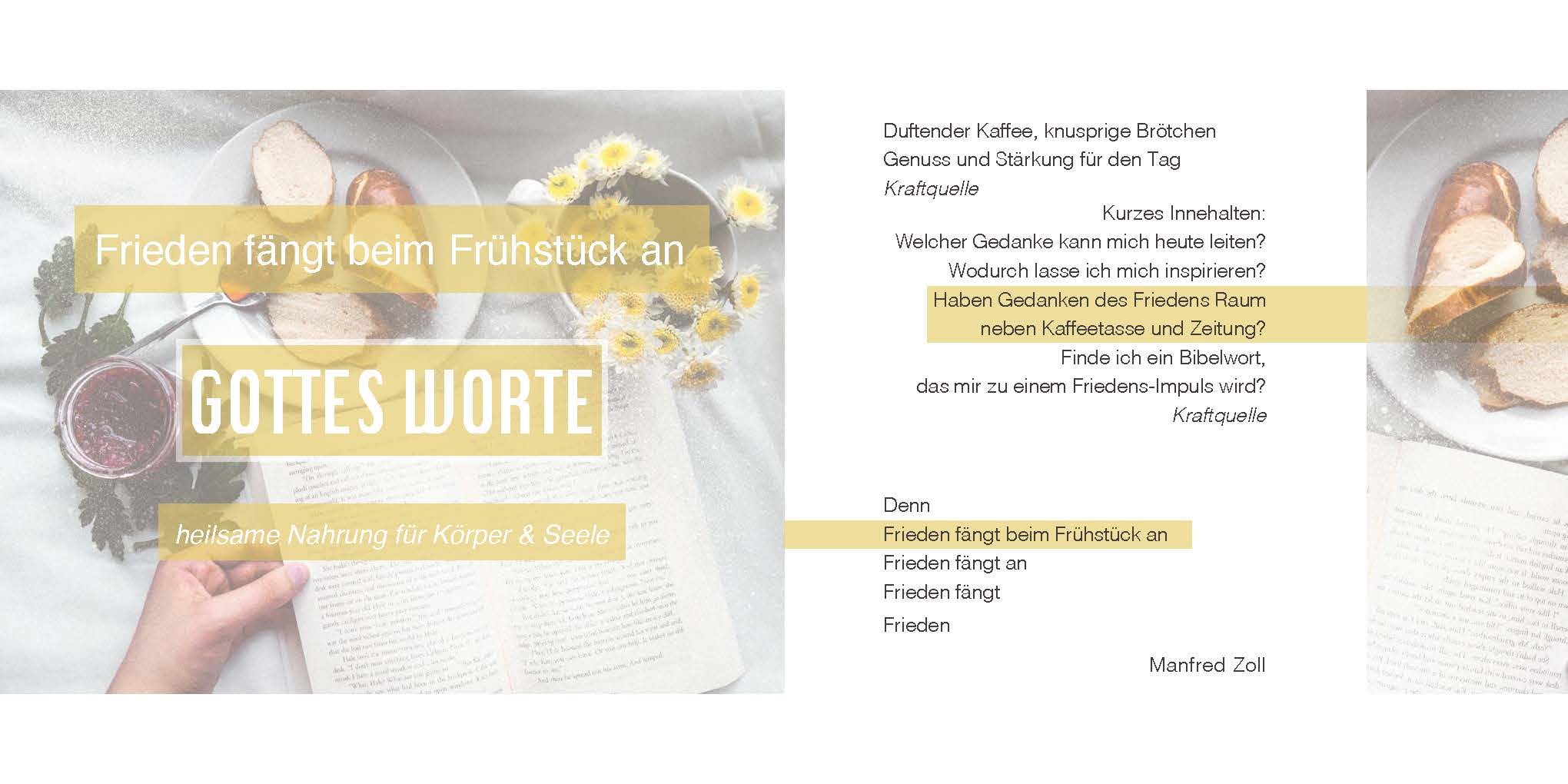 In dem kleinen Impulsheft breiten die Autoren ihre Gedanken zu Frieden und Unfrieden in nachdenklich, kreativer und überraschender Weise aus. Sie laden den Leser ein, den eigenen Unfrieden wahrzunehmen, sich mit dem Himmel zu verbinden und sich vom Frieden Christi beschenken zu lassen. Denn: Gottes Wort sei heilsame Nahrung für Körper und Geist und Frieden fange beim Frühstück an, wie es in einem Impulstext des Heftes heißt.